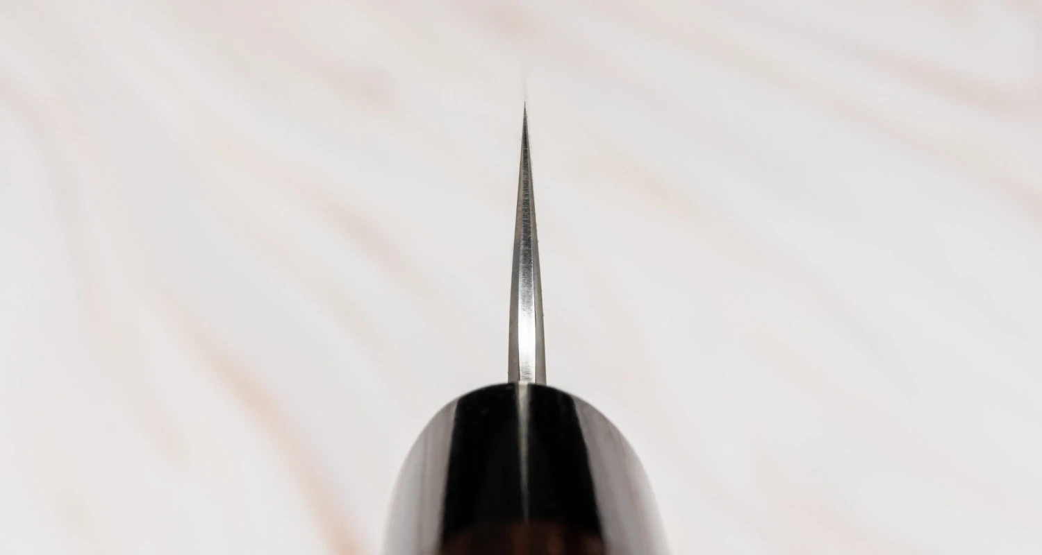 It has a double bevel (symmetrical) blade. Viewed from the back of the blade, the knife is heavier and stronger at the handle and thinner and more precise at the tip. This blade shape makes the knife easier to use because the blade is very responsive, easily maneuverable and nicely balanced. This type of blade design is also called distal taper – you can read more about it in the article on blade geometry. Â