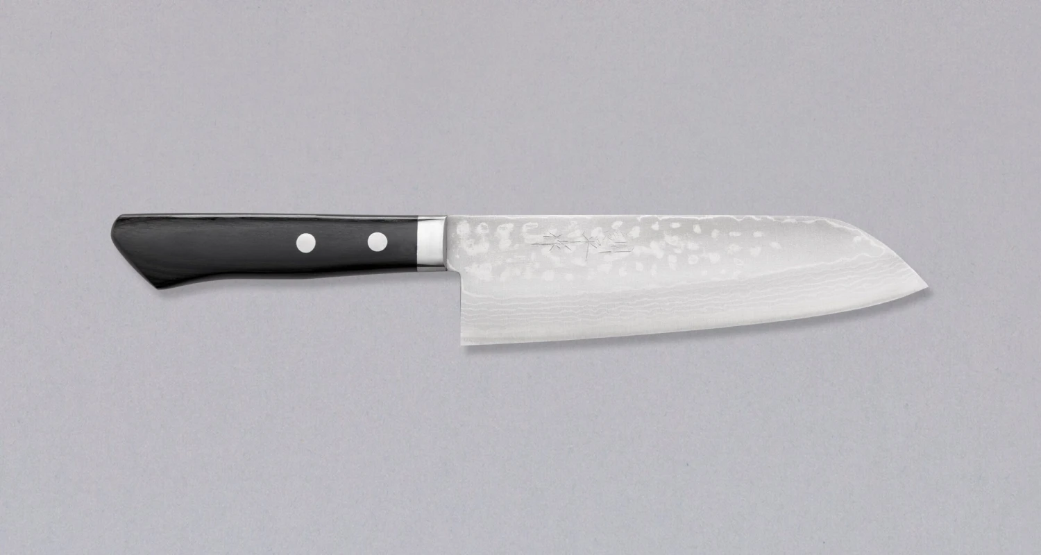This Santoku was fitted a yo-style, Western-type handle made of durable black pakka wood. It also features a stainless bolster for a more comfortable grip, and for a smoother transition from the handle to the blade. The knife tang ends halfway through the handle, further reducing the weight of the knife and pushing the balance more towards the tip of the blade, like with wa-style, traditional Japanese handles. The handle will fit well in your hands for both the hammer and pinch grip.