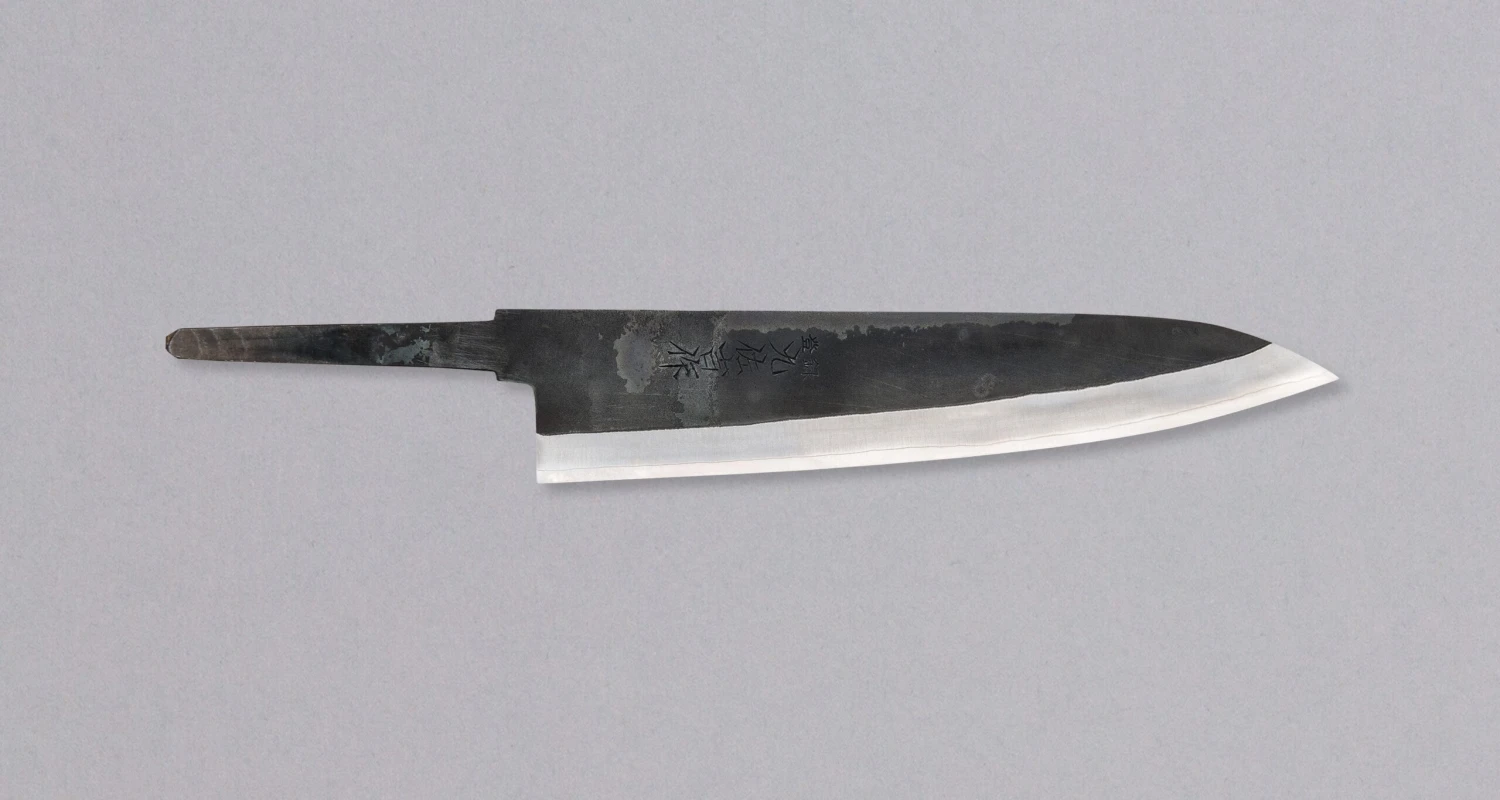 Osamu-san chose a warikomi (also called “split and insert”) method. A glowing hot piece of iron is split and a piece of steel is inserted. The new material is now forged into one piece composed of a very hard steel core in a jacket of two external layers of softer, stainless steel. This creates a highly durable kitchen knife with a slightly more pliable core. The main advantage of these knives is that they are thin, sharp and retain their edge very well.