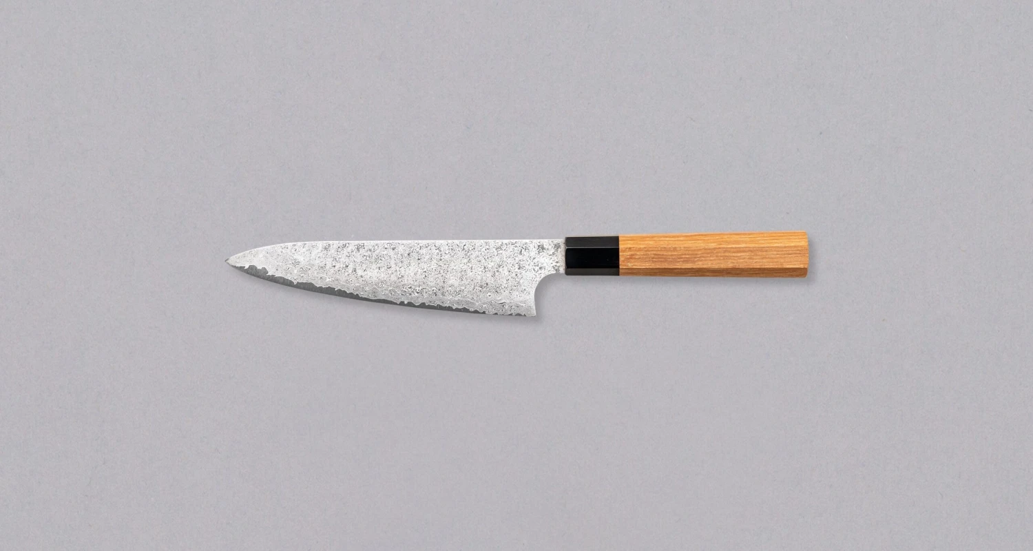 Petty is a small knife for versatile use in the kitchen (a smaller version of the multipurpose gyuto knife). This blade is an essential part of any knife collection, taking on those more delicate tasks where longer knives prove too long and too steep. Because the blade is thin, this petty excels at delicate tasks, as it glides precisely and smoothly through food while ensuring comfortable and easy maneuverability. Petty knives are usually designed for in-hand use, but the width and length of the blade also make this knife well-suited for chopping and slicing on the cutting board. The shape of the blade has a gentle curve in the belly and is also great for rocking cutting technique.
