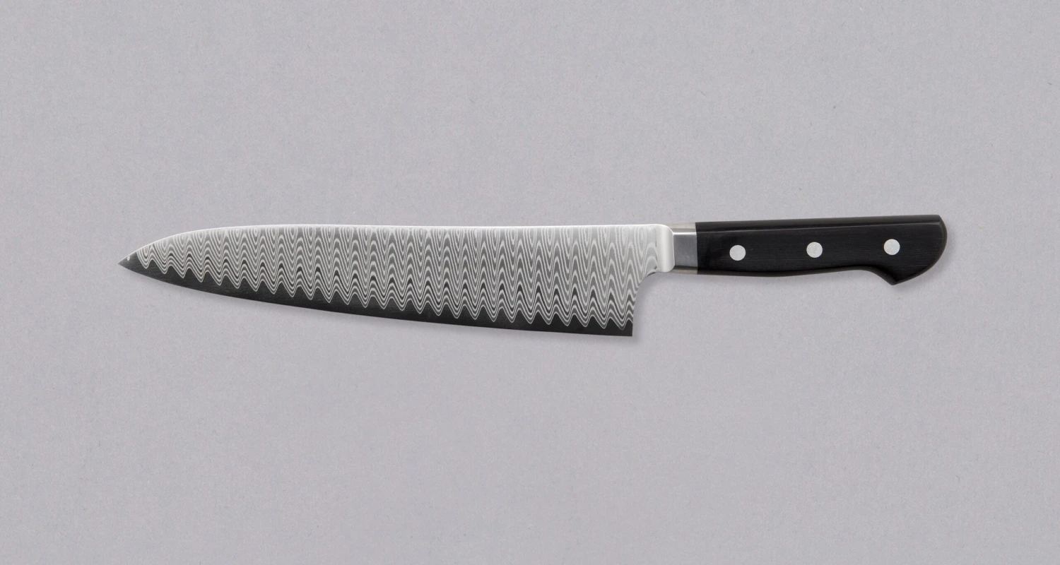 Hayabusa Gyuto HAP-40 Damascus 240mm is a multi-purpose Japanese kitchen knife, suited for preparing meat, fish and vegetables. Itâs a nonconformist piece that just screams futurism. Featuring a classic western style handle and a brazen look, itâs quite a unique knife. The wavy damascus curves on the blade are sharp and steep, reminiscent of high-frequency waves and are synchronous with up-and-down chopping motions.Â
