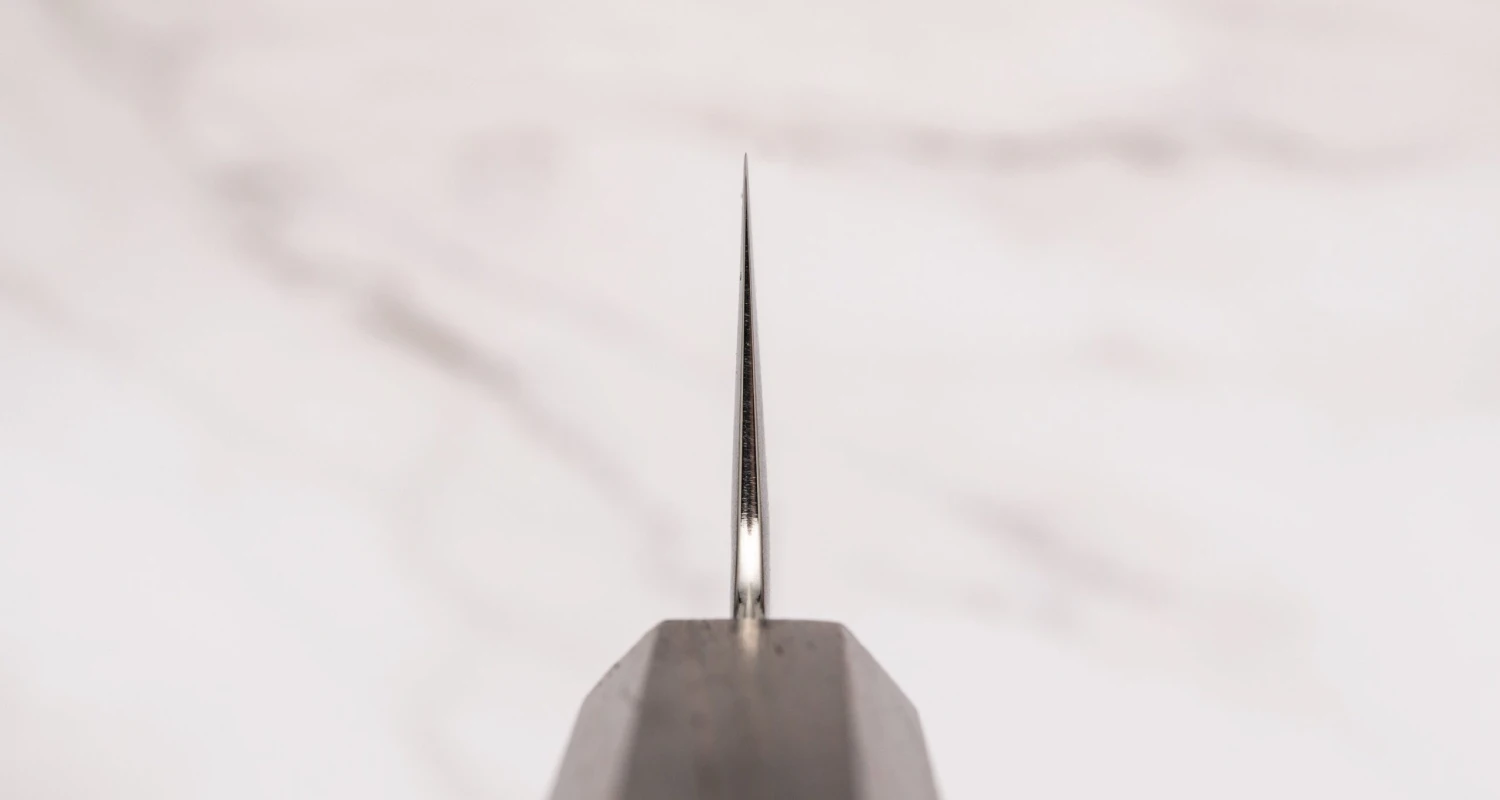 The knife features an octagon Japanese (Wa) style handle made out of bubinga wood. The octagon shape of the handle provides a comfortable and secure grip, allowing for precise control during use. Bubinga is a durable and dense tropical wood, known for its distinct brown color with dark patterns. Its strength and stability make it popular for crafting knife handles, furniture, and musical instruments. It has a beautiful texture and polishes well, giving it a smooth and elegant appearance.