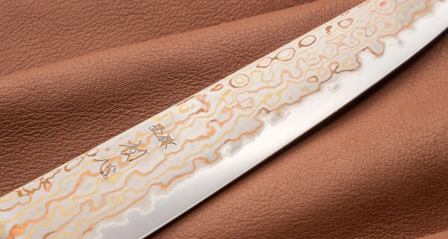 But what takes the cake are its visual qualities — the unique rainbow damascus pattern, which was masterfully achieved by carefully layering copper and brass, has a slight matte sheen that transitions into the Aogami #2 core steel with a highly polished mirror finish at the cutting edge.