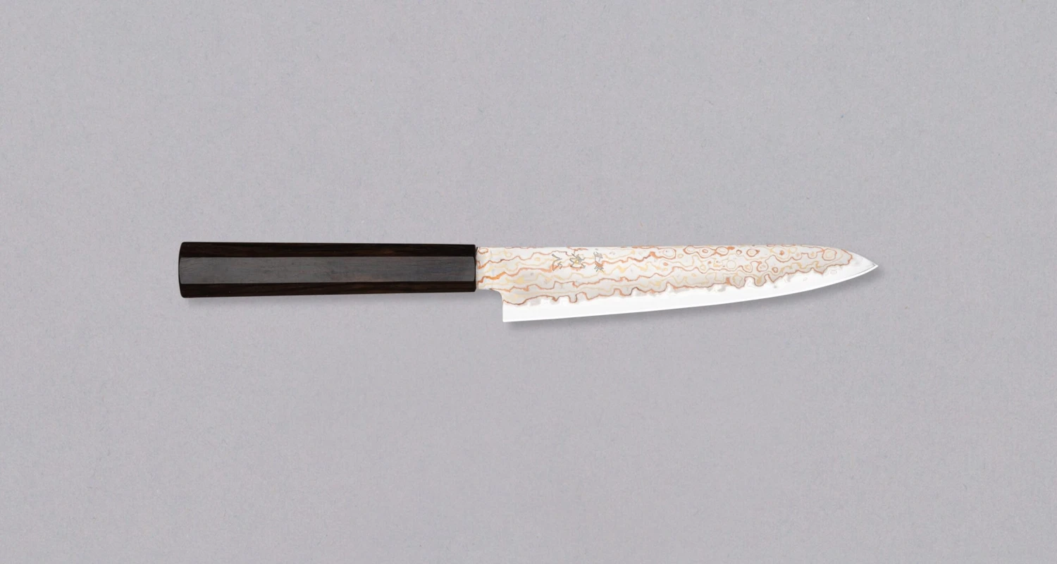 Hayabusa Petty Aogami #2 Rainbow Damascus 150mm (5.9″) is a small versatile Japanese kitchen knife ideal for all in-hand work as well as use on the cutting board. Its blade, made of Aogami #2 steel, tapers towards the tip, offering additional precision when cutting.