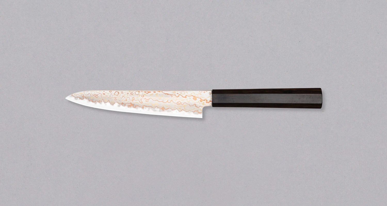 Some knives impress with looks, some with functionality. The Hayabusa Petty Aogami #2 Rainbow Damascus 150mm (5.9″) from the Rainbow Damascus line impresses with both.
