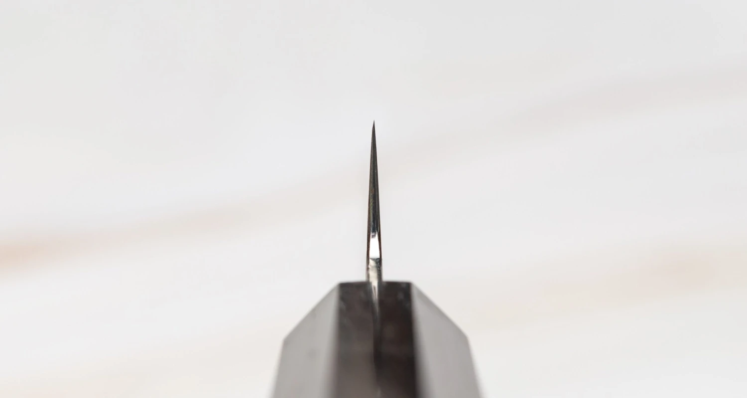 It has a double bevel (symmetrical) blade. The cutting edge is sharpened to a 50/50 angle and stays sharp even after hours of constant use. Tapering from the handle to the tip, the blade is extremely thin, which allows the user to work precisely even with the smallest ingredients.