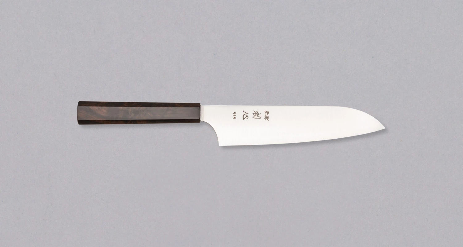 Hayabusa Santoku Aogami Super Ebony 180mm (7.1″) is a versatile Japanese kitchen knife ideal for preparing meat, fish, and vegetables. With this knife, frequent sharpening becomes a thing of the past, as its superb edge retention ensures long-lasting performance. A true star of any knife collection, this blade is anything but basic.