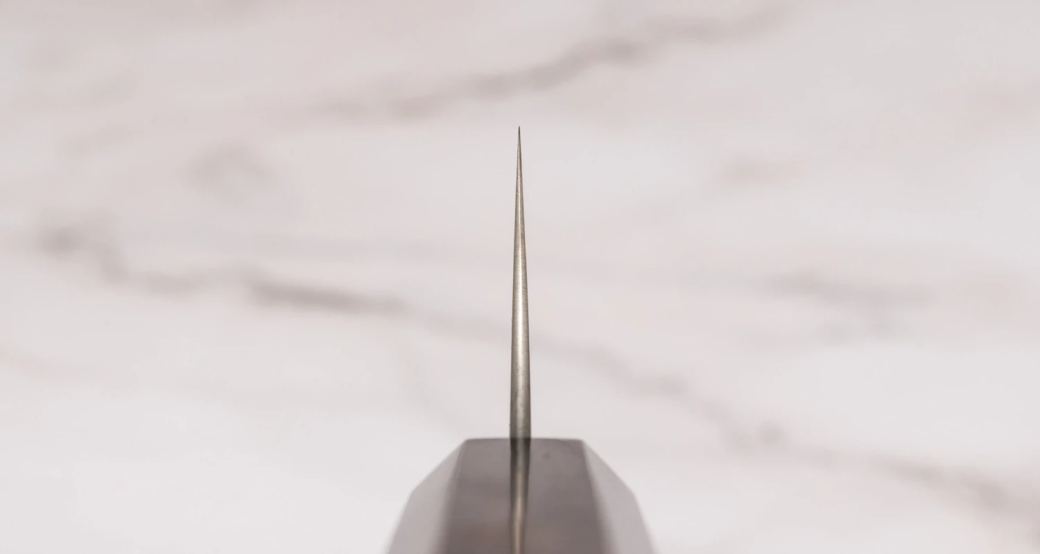 The blade features a clean, highly polished mirror finish (also called migaki). It is a simple, minimalistic blade. The surface of the knife is thinned and polished during the manufacturing process to expose the smooth and shiny surface of the knife. Such a finished look minimizes damage to the food cells during cutting, so it is suitable for the most delicate tasks.