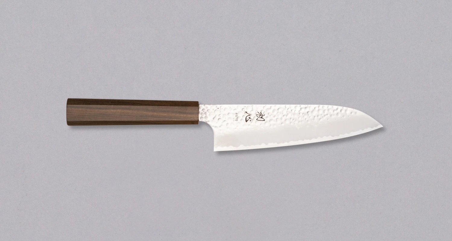 Hayabusa Santoku VG-10 Tsuchime Bubinga 180mm (7.1″) is a versatile knife that is perfect for both home and professional kitchens. Made from VG-10 steel, it has a sharp, thin blade that is ideal for cutting meat, vegetables and more. The Tsuchime finish features small, round indentations that add texture and depth to the blade, while the Kasumi finish creates a contrast between the matte and shiny surfaces. The durable Bubinga wood handle provides a comfortable grip, making it a practical and stylish addition to any kitchen. A great choice for chefs and home cooks who value quality and performance.