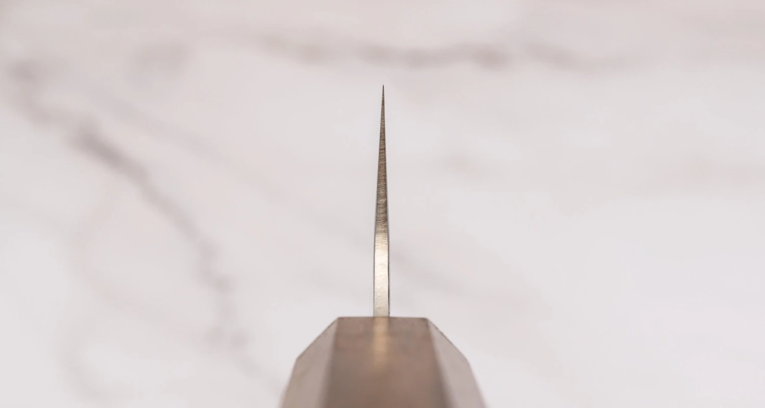 The knife features an octagon Japanese (Wa) style handle made out of bubinga wood. The octagon shape of the handle provides a comfortable and secure grip, allowing for precise control during use. Bubinga is a durable and dense tropical wood, known for its distinct brown color with dark patterns. Its strength and stability make it popular for crafting knife handles, furniture, and musical instruments. It has a beautiful texture and polishes well, giving it a smooth and elegant appearance.