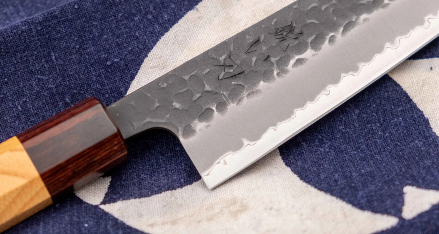 The Kuro-uchi (black) patina on the upper part of the knife gives it a unique and rustic appearance. Kuro-uchi finish, the unprocessed (black) part on the top side of the blade has already developed a dark patina, which protects the blade and gives it a traditional Japanese look. The knife bears visible impressions of the hand-forging process (round hammer dents on the blade), which gives it a beautiful finish and also prevents food from sticking to the blade.