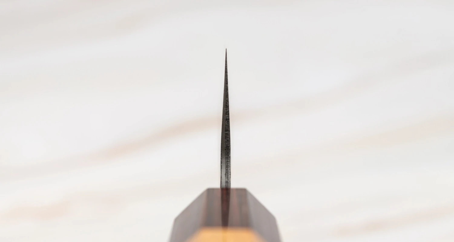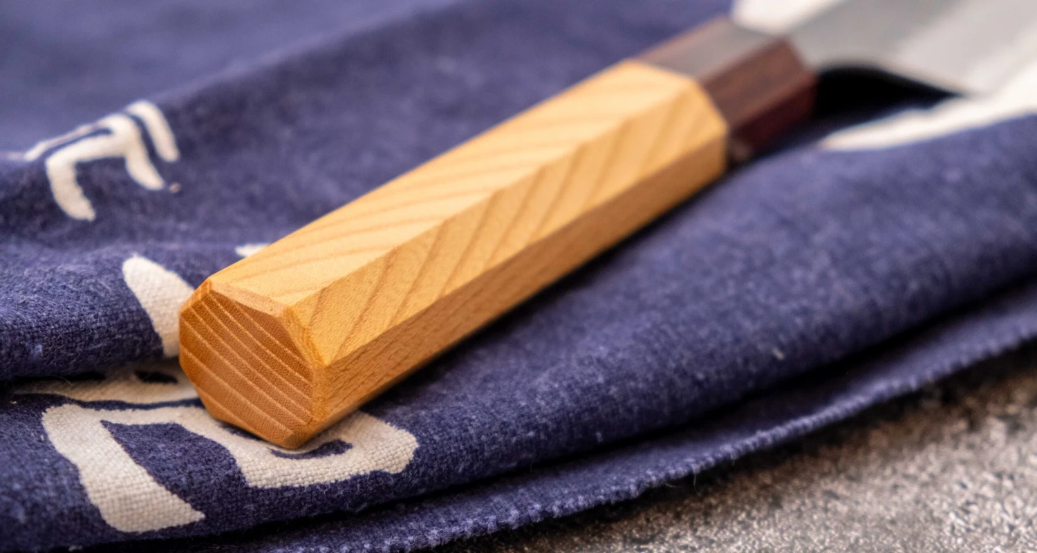 This knife is fitted with a traditional Japanese handle of octagonal shape, made of mahogany and zelkova wood. The blade is also available without a handle here. If you prefer this option, you can order a custom handle separately.