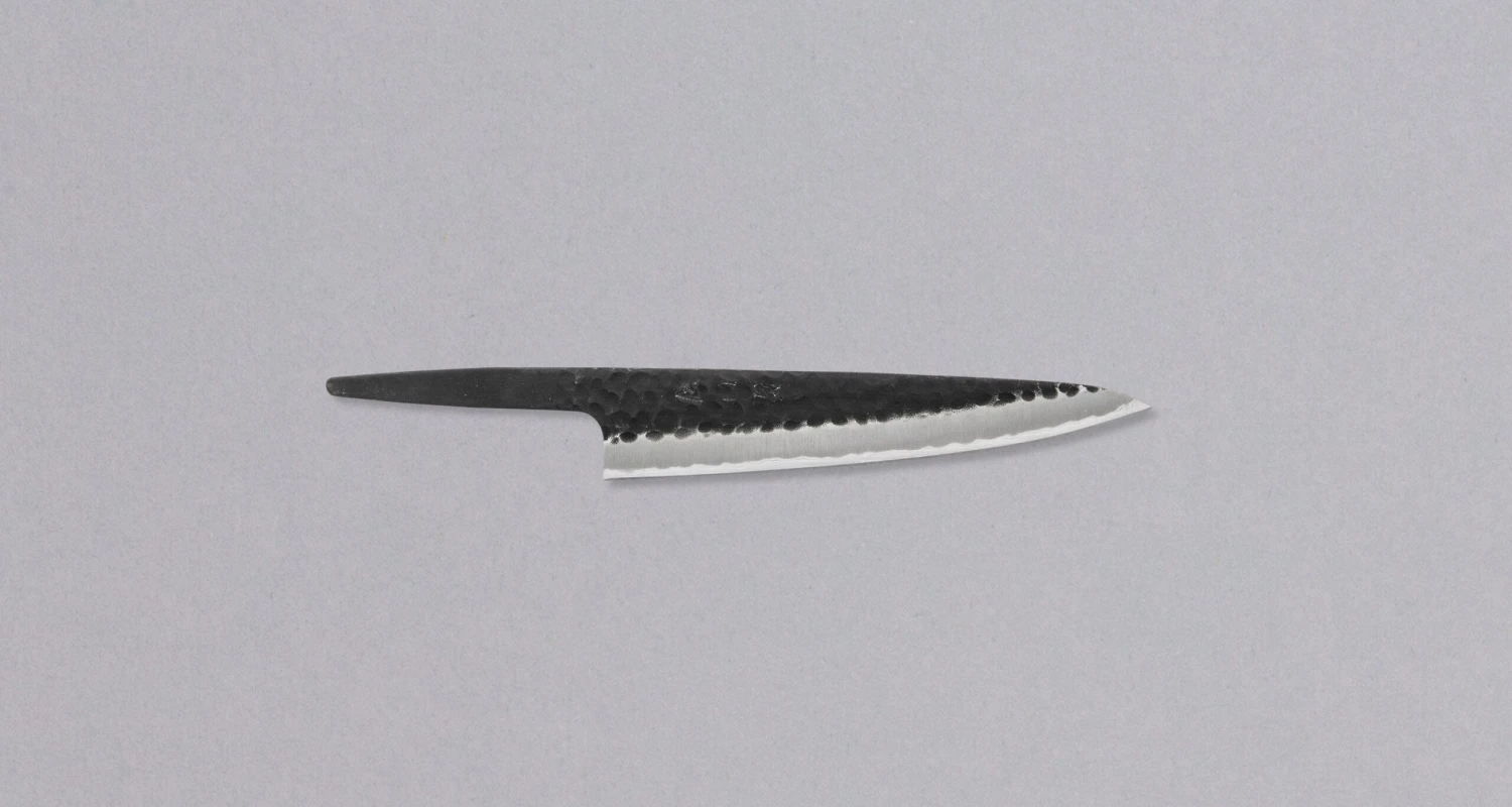 Hokiyama Petty Kuro-uchi 135mm (5.3″) is a great versatile knife with a black Kuro-uchi protective patina and hammer dents, which gives it a unique and rustic appearance. The petty blade shape is a smaller version of a Gyuto knife (Chef’s knife), which makes it a must-have knife in every kitchen,