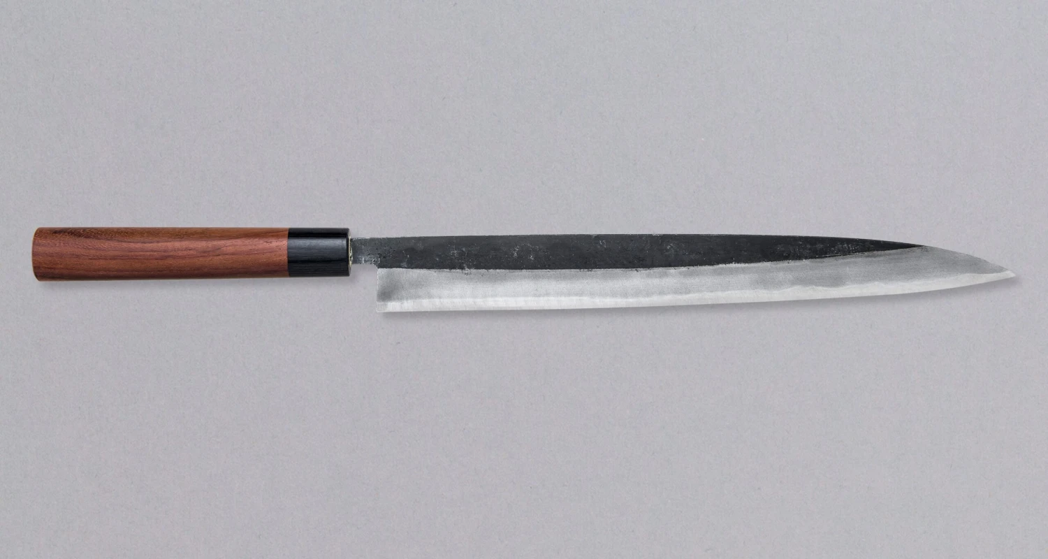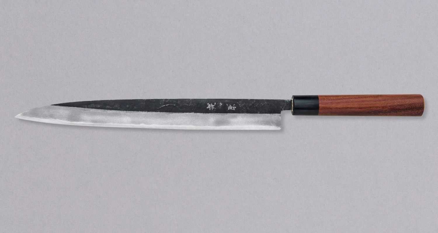This double bevel traditional sujihiki might be a bit on the heavier side but is nicely balanced thanks to a very tapered spine (from 4 mm at the handle to 1 mm at the tip). The classic look of this knife will fit any kitchen, a professional or home one. Forged from Aogami #1 or Blue Paper #1 steel, this rustic looking kuro-uchi blade, even with minimal maintenance, will take a steep edge and hold it for longer than a comparable European stainless-steel knife.