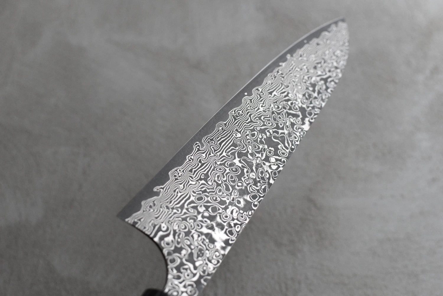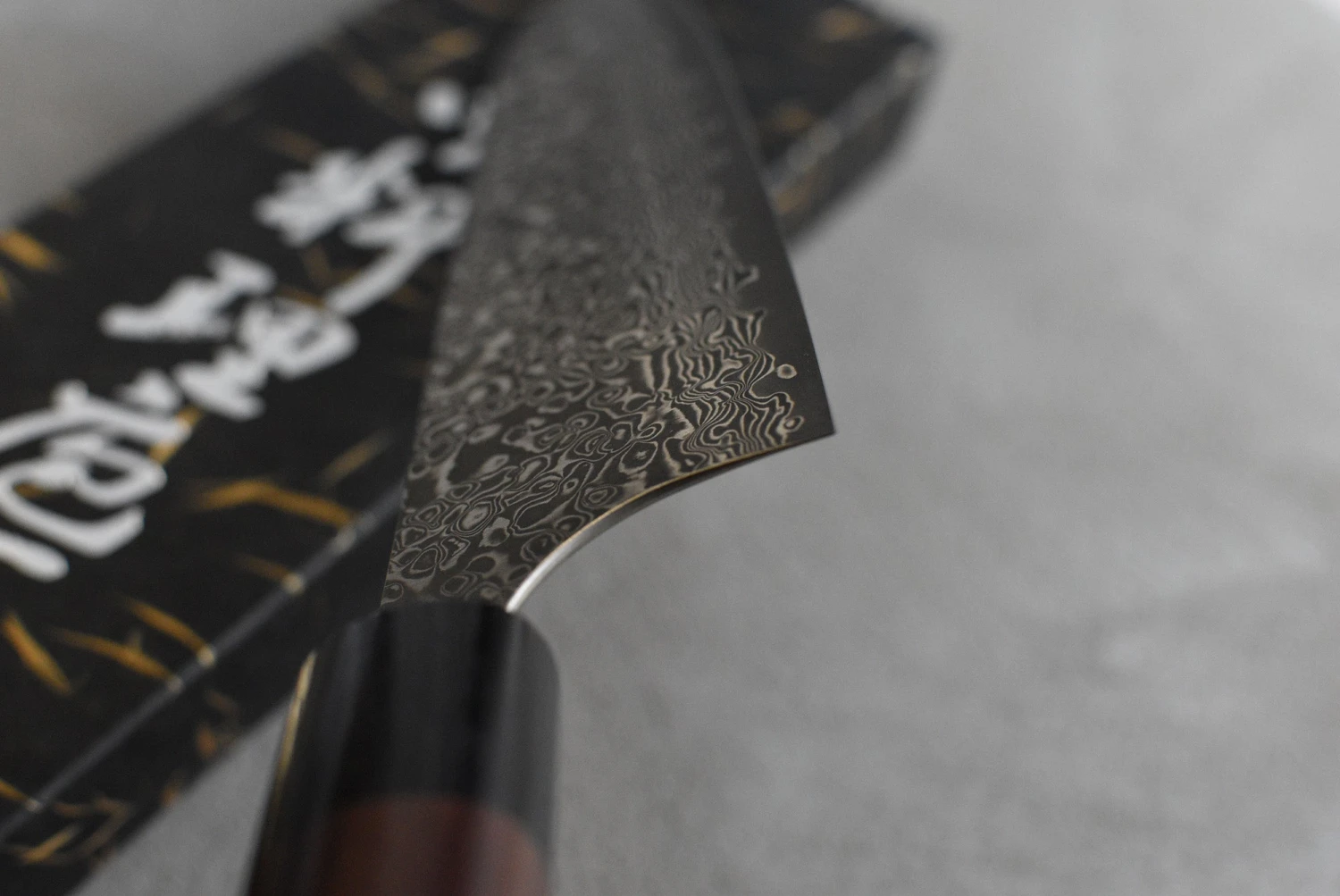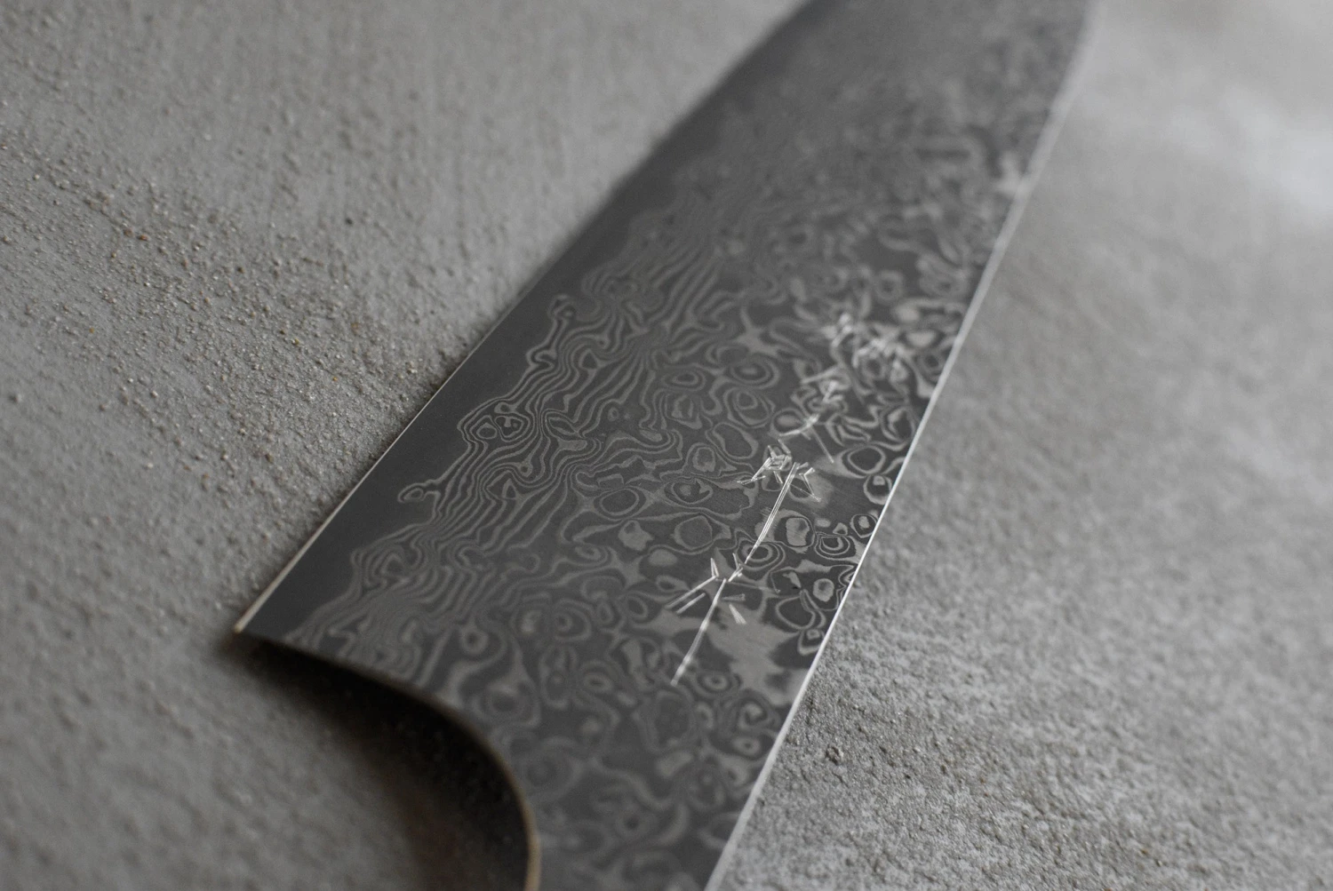 The hypnotic Suminagashi pattern and perfect blade profile left us speechless at first glance at this very special knife. Suminagashi (“floating ink“) is a term for a marbled pattern (called Damascus in knives), made by Yoshimi Kato in this gyuto.