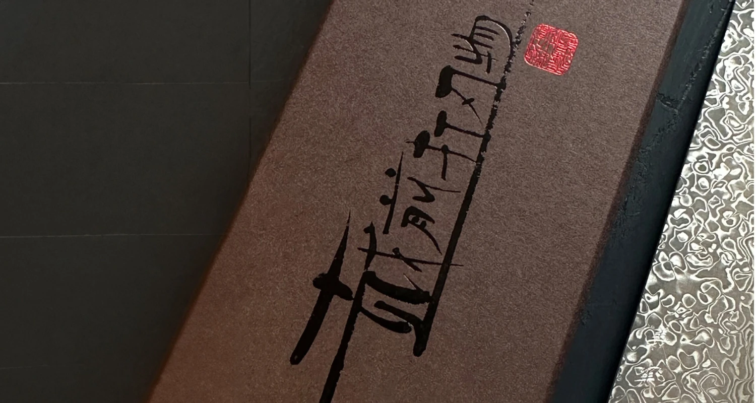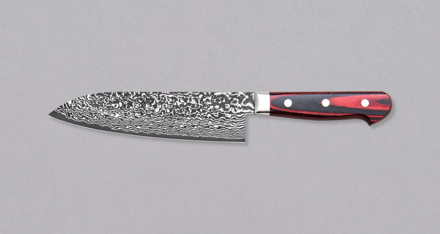 Yoshimi Kato, a relatively young blacksmith from the famous Takefu village, known for many skilled blacksmiths, gave the blade a Western-type, durable red&black pakka wood handle. The handle was attached to the blade with three stainless pins and features a stainless bolster for a smooth transition from the handle to the blade.