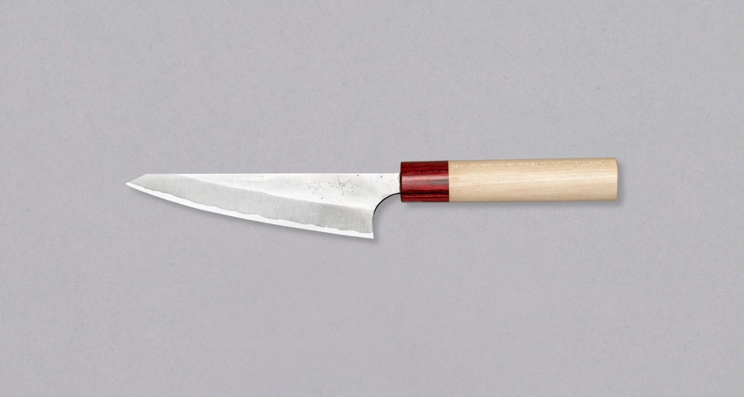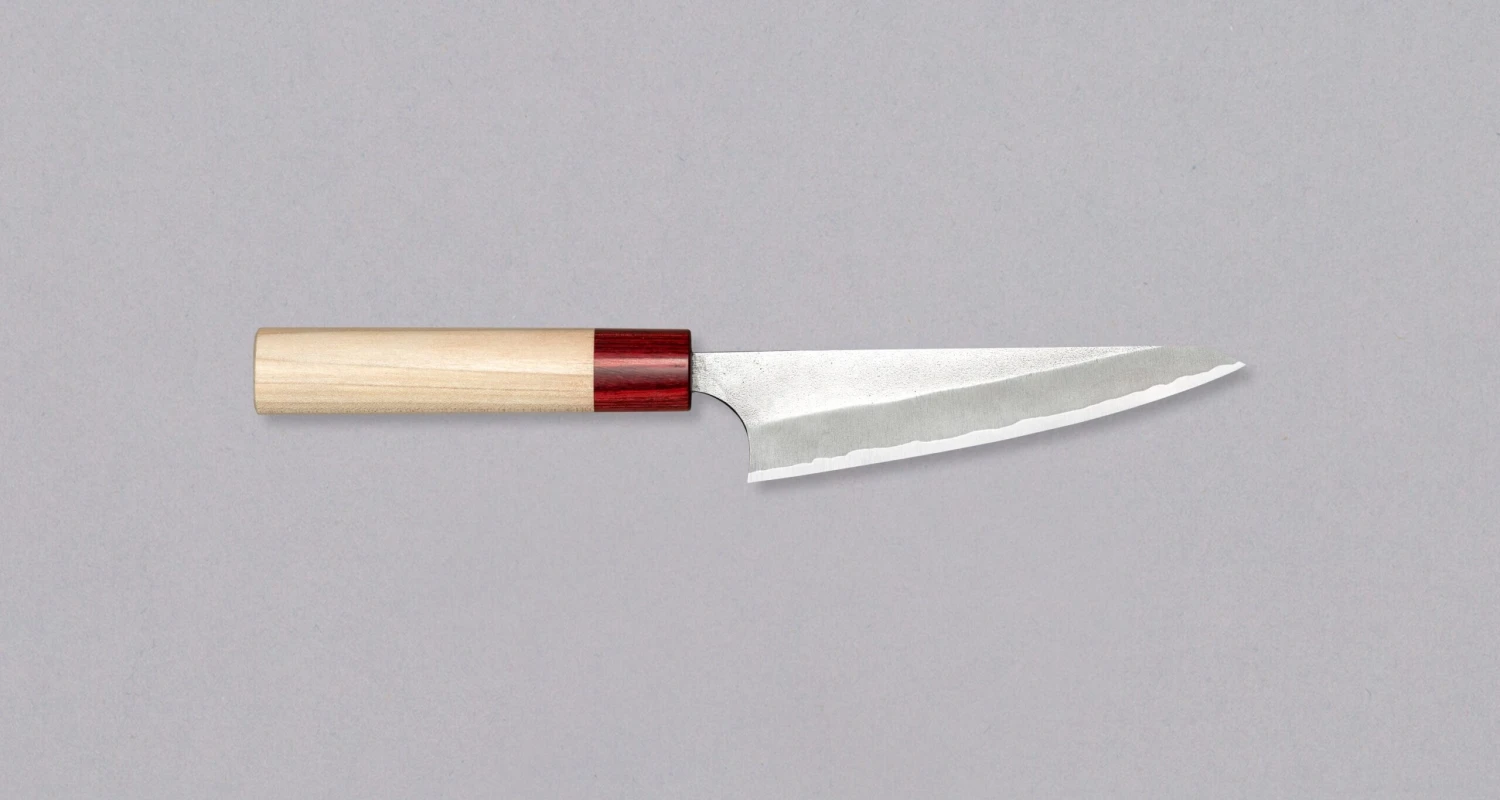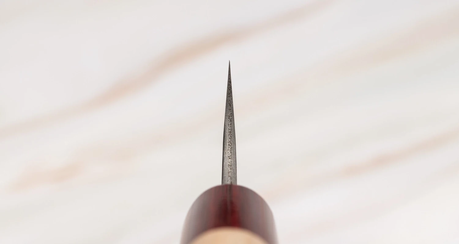 The blade is fitted with an oval white magnolia handle in traditional Japanese style. The red ferrule made of pakka wood gives this very light knife a bit of color for dramatic effect.