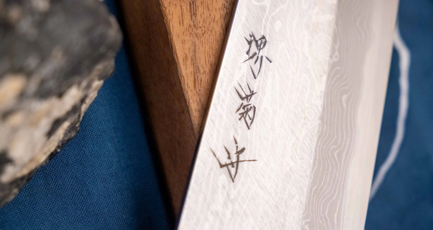 The front surface of the blade is adorned with a hand-chiseled kanji, while the uraoshi side bears the mark of the core steel and a wavy line denoting the border between the hagane and jigane. This cladding line can only be done by an experienced blacksmith.