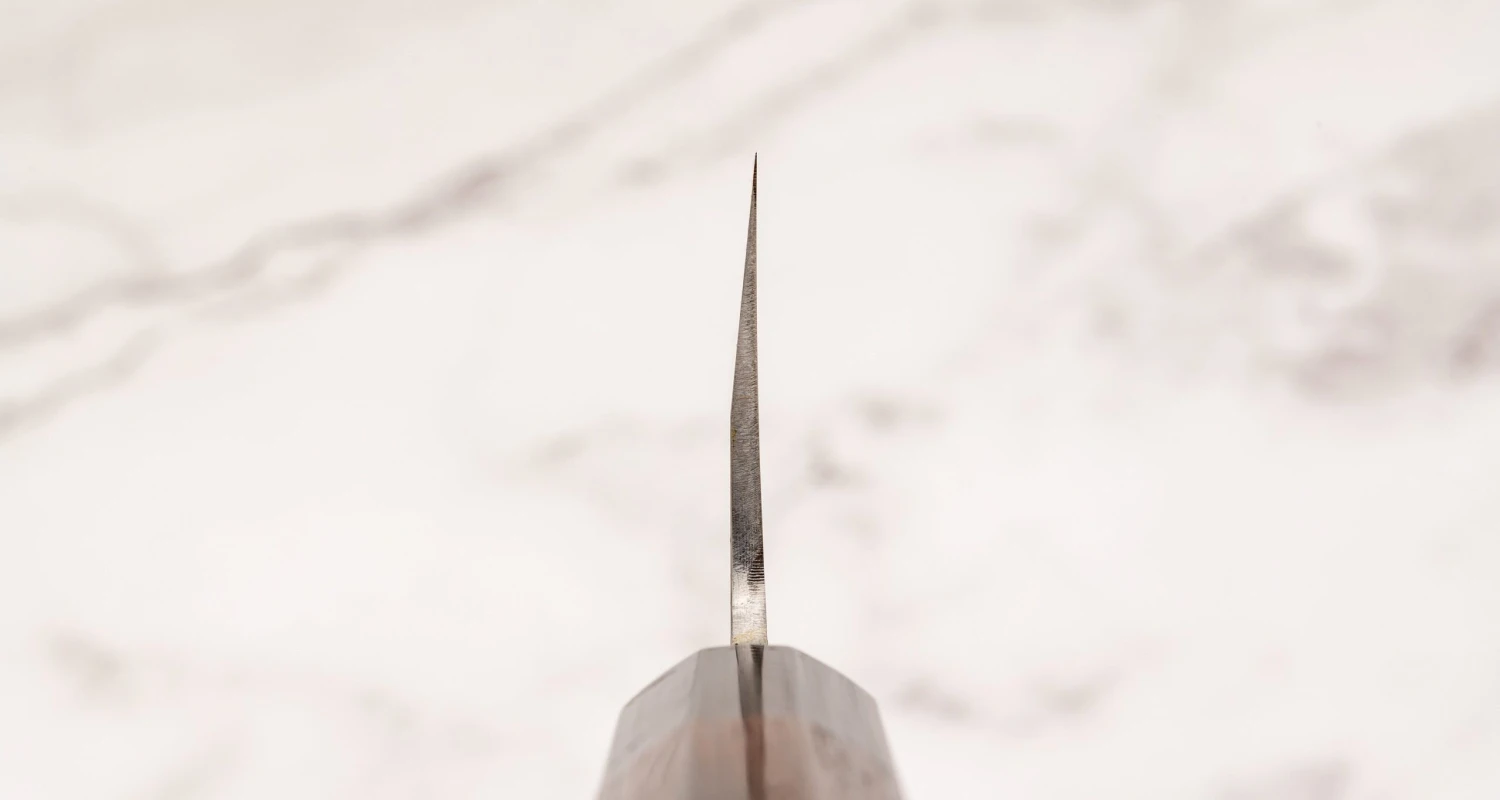 This gyuto differs from others of its kind by two very distinct characteristics. The first one is the grind, and the second is the blade’s unusual shape. The spine is straight and the belly tapers in a continuous curve, until making a sharp turn right before the point. This is where the name sakimaru comes from, it refers to tanto tip.