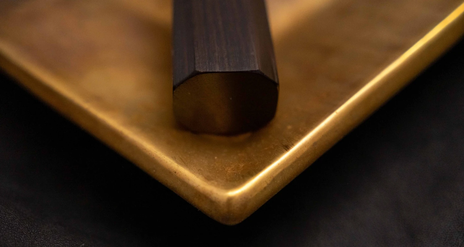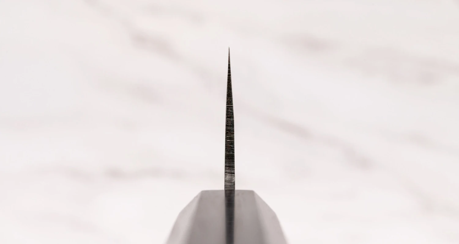 The blade was laminated with soft iron, which is iron with only a small amount of carbon added to it. Laminating the blade improves its structural integrity, as the knife’s core is made of hard—and therefore brittle—high-carbon Aogami #1 steel that is prone to breakage on its own.