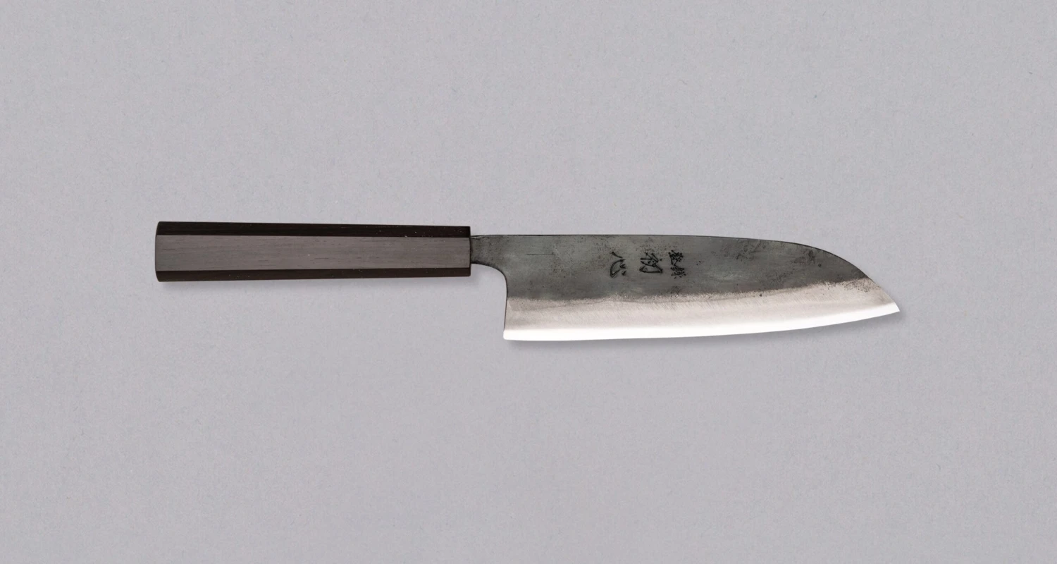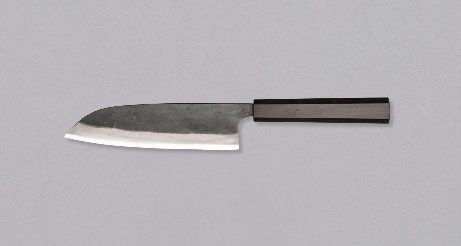 Kokugei Santoku Aogami #1 Kuro-uchi Ebony 165mm (6.5″) is a multi-purpose Japanese kitchen knife that is suitable for preparing meat, fish, and vegetables. The Kokugei [the Japanese word Kokugei translates as “black whale”] Santoku is an excellent choice for anyone entering the world of carbon steel knives, combining high performance with the authentic tradition of Japanese craftsmanship.