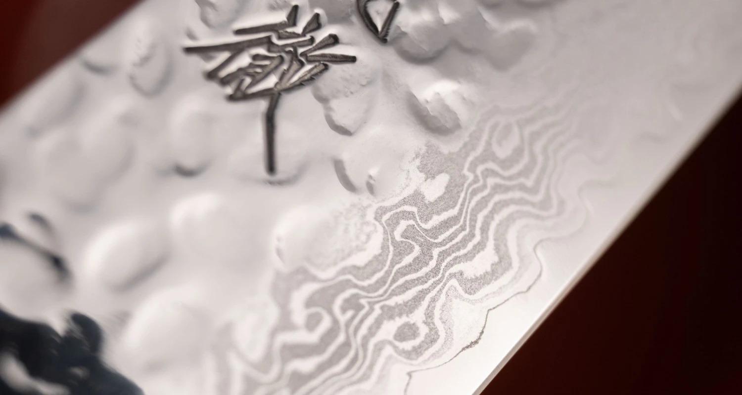 The blade consists of 17 layers of steel. Steels with high hardness have many advantages, but because of their hardness, they are more brittle and thus more susceptible to damage. Blades made of such steels are therefore laminated using the san-mai method, thereby improving their structural integrity and consequently resistance to various impacts and other physical factors that could lead to damage. San-mai means “three layers” in Japanese and refers to a blade that consists of a primary inner layer of harder steel (hagane) and two outer layers of softer steel (jigane) that are made up of multiple layers.