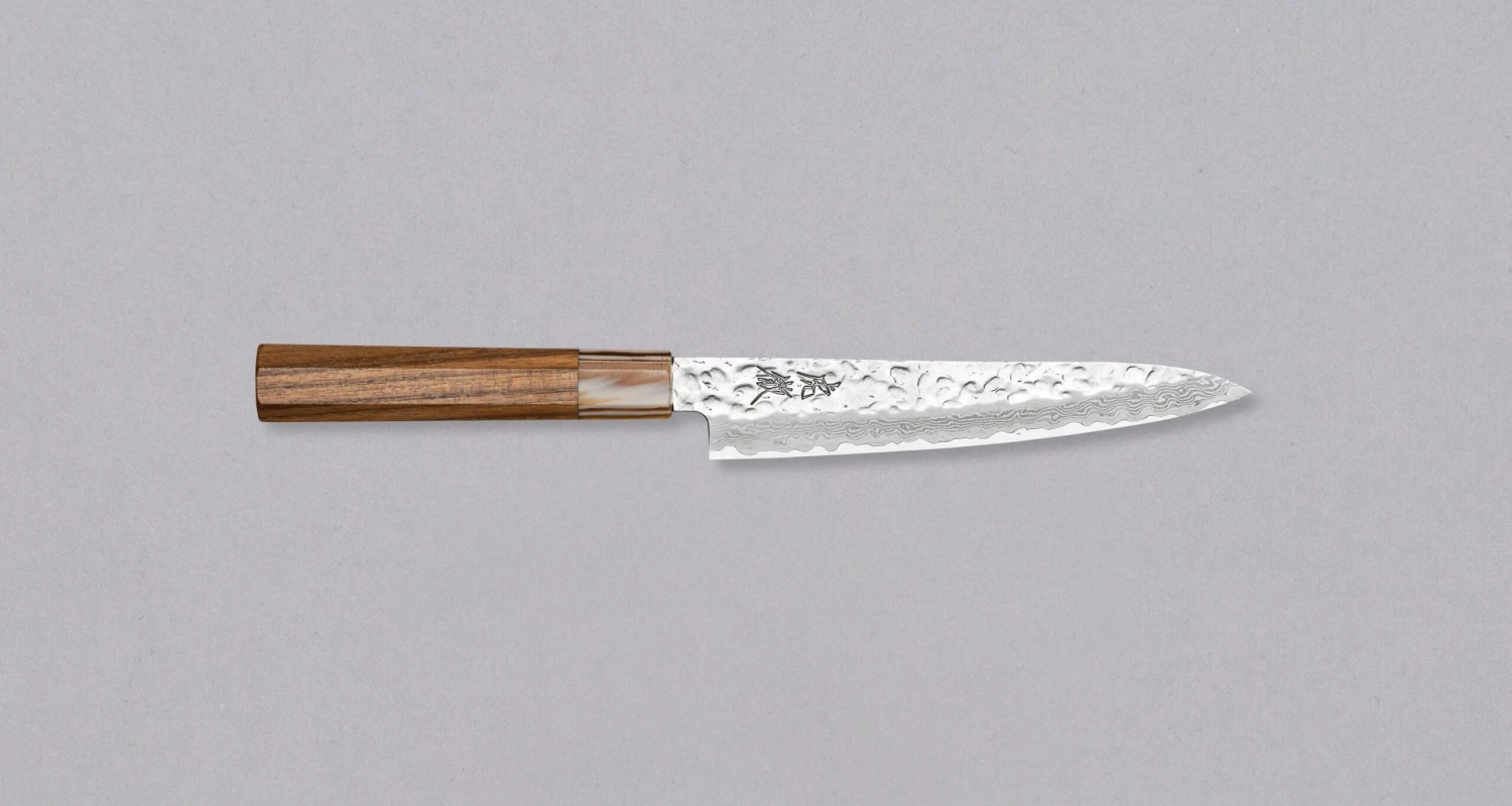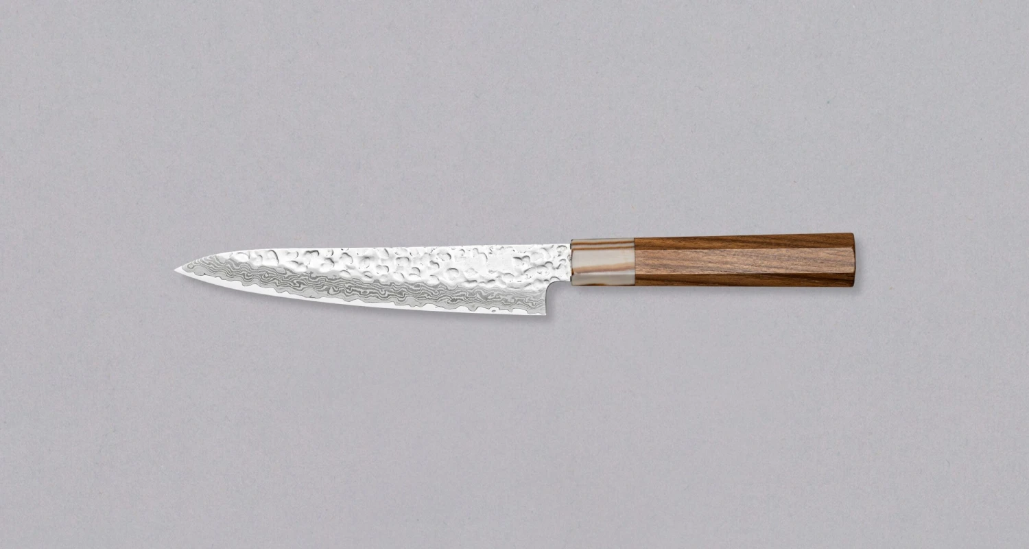 The Kotetsu VG-10 Damascus Petty 150 mm is a small Japanese knife with visible hammer prints, a damascus pattern and a classic Japanese (wa-style) teak handle. It will impress anyone who appreciates aesthetically designed kitchen utensils.