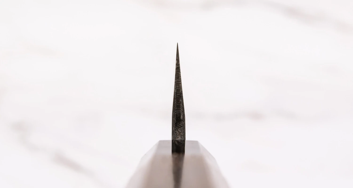 The blade was laminated with soft iron, which is iron with only a small amount of carbon added to it. Laminating the blade improves its structural integrity, as the knife’s core is made of hard—and therefore brittle—high-carbon Aogami #1 steel that is prone to breakage on its own.