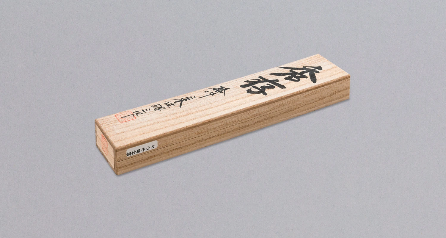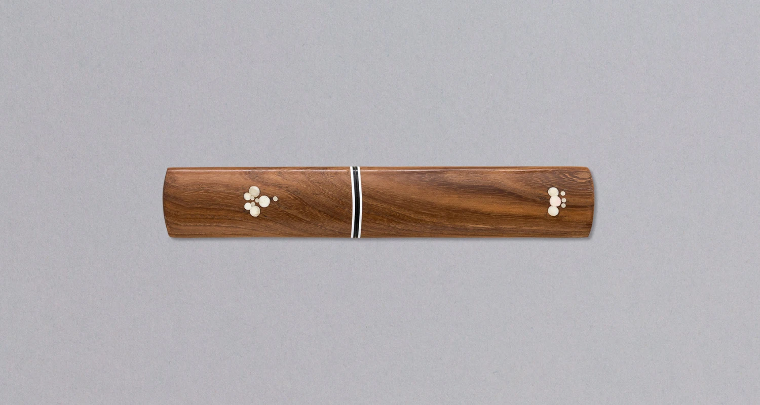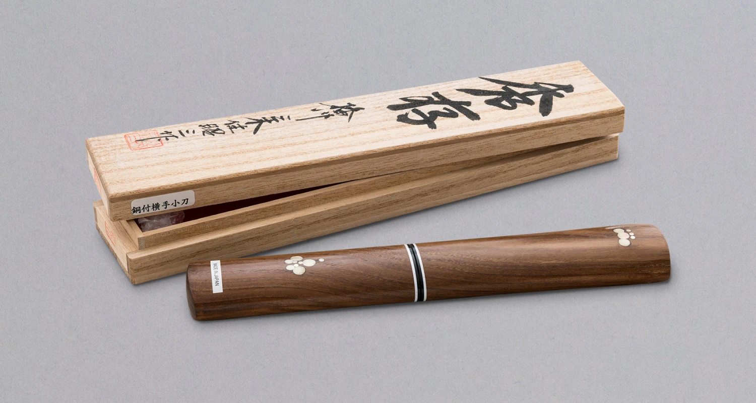 Yokote is a Japanese laminated blade for shaping, carving, and even splicing trees in the garden. The single-bevel blade has a diagonally cut tip, which is extremely useful for precise tasks. Kogatana also means “little sword“. It is therefore a small and useful (utility) knife with a beautiful wooden handle, which continues into a protective saya, formed from a single piece of wood. The handle and saya have a delicate decorative marquetry in the shape of a plum blossom, which symbolizes the coming of spring in Japan. It is also a sign of virtue, courage, marriage, happiness, overcoming difficulties, and a symbol of samurai.