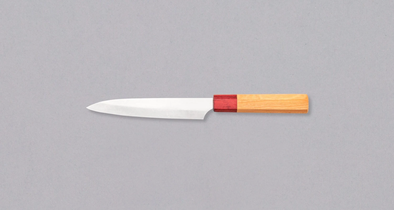 The traditional Japanese (Wa) handle is made of maple and finished off with a red Pakka ferrule. Due to its symmetric octagonal shape, it fits comfortably in the right as well as the left palm.