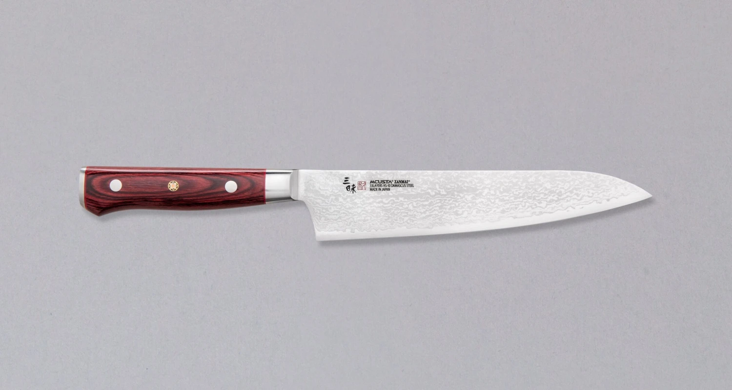 Mcusta Gyuto Damascus Flame is a looker. 33 layers of softer and stainless Damascus steel resemble a flame spreading from the bottom to the tip of the blade, giving every knife a unique look. The core of this knife is made of great performing, easy to resharpen, VG-10 steel.