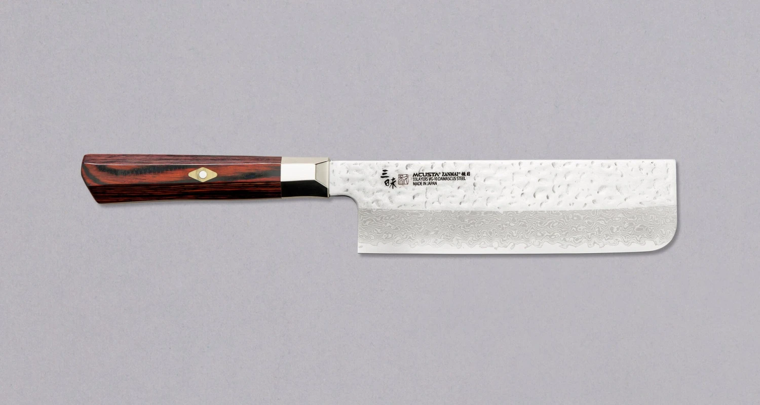 Mcusta Nakiri Supreme Hammered is a great performing kitchen knife, made from the popular VG-10 steel, clad into 33 layers of softer, stainless Damascus steel. The top part of the blade features dents from the hammer, which have been polished to a high polish, while the bottom part of the blade features a subtle, wavy Damascus pattern.