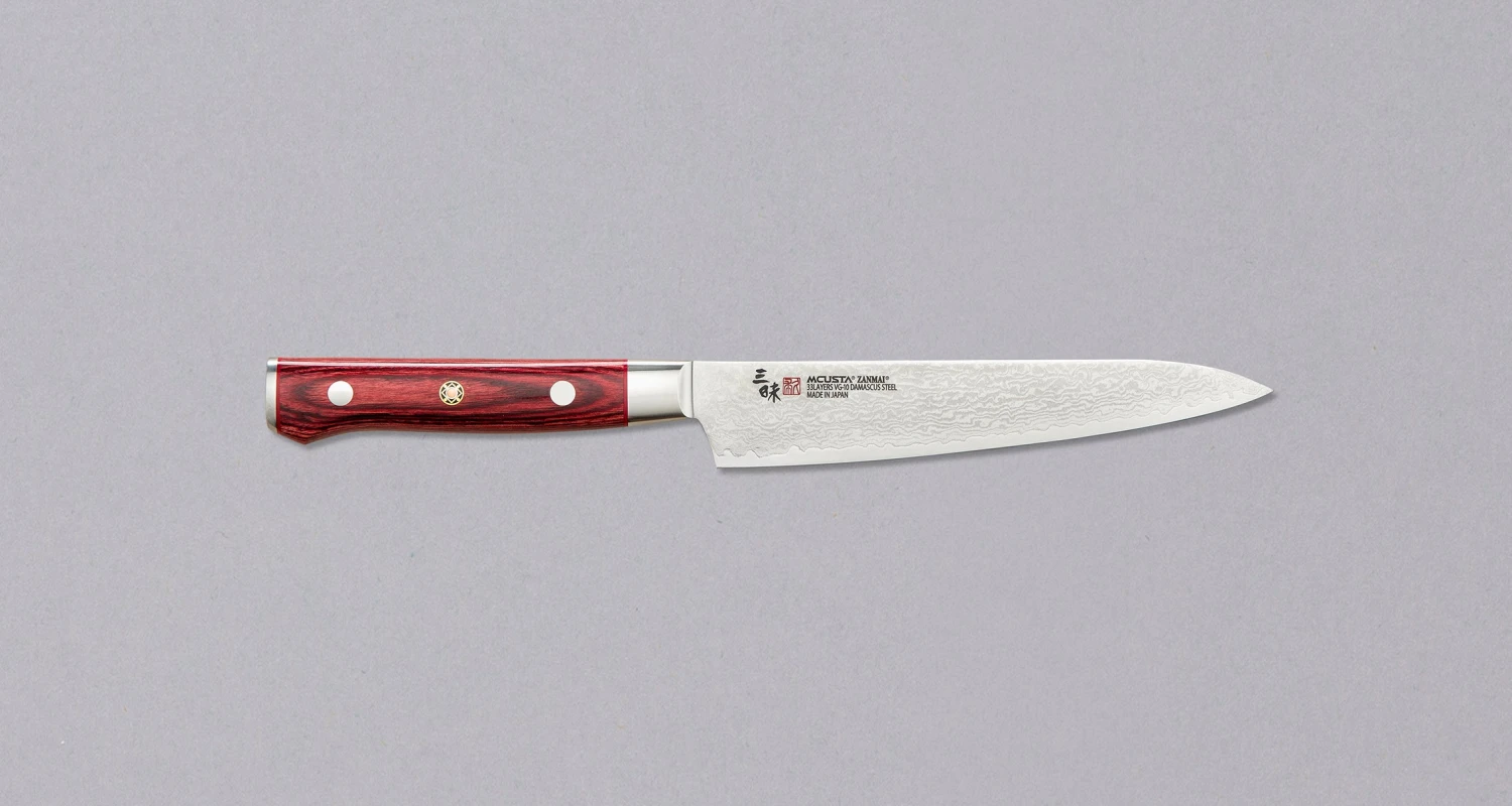 Mcusta Petty Damascus Flame is a looker. 33 layers of softer and stainless Damascus steel resemble a flame spreading from the bottom to the tip of the blade, giving every knife a unique look. The core of this knife is made of great performing, easy to resharpen, VG-10 steel.