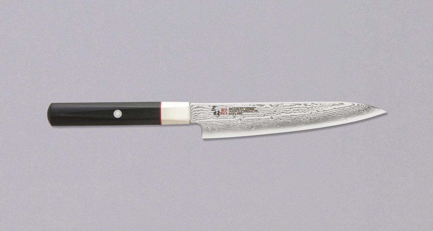 Mcusta Petty Hybrid Splash is another beautiful kitchen knife, cut out from the beams of Mcusta’s lasers, and then sharpened to a razor-edge sharpness by hand. It got its name (Splash) due to the very pronounced Damascus pattern on the blade, making every single blade a unique piece of art, so this knife is a great choice for all the Damascus lovers out there.
