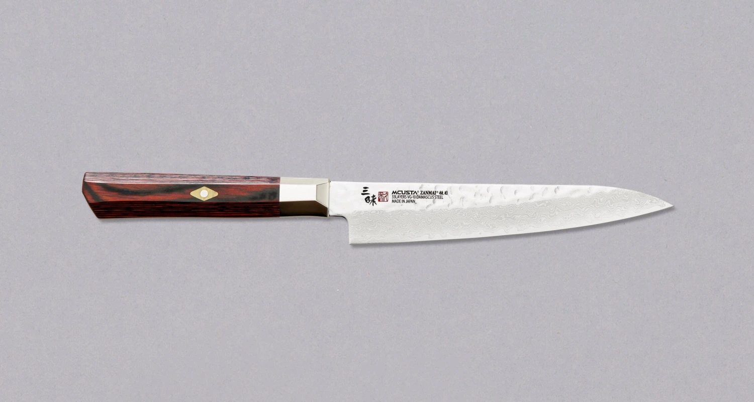 Mcusta Petty Supreme Hammered is a great performing kitchen knife, made from the popular VG-10 steel, clad into 33 layers of softer, stainless Damascus steel. The top part of the blade features dents from the hammer, which have been polished to a high polish, while the bottom part of the blade features a subtle, wavy Damascus pattern.
