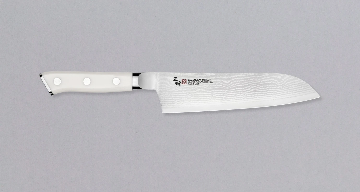 Its thin blade, typical for all Mcusta knives, will slice through your veggies, meat, and fish with ease and almost without any applied pressure to the knife. You can also mince and dice with it, like with all Santoku-shaped knives.