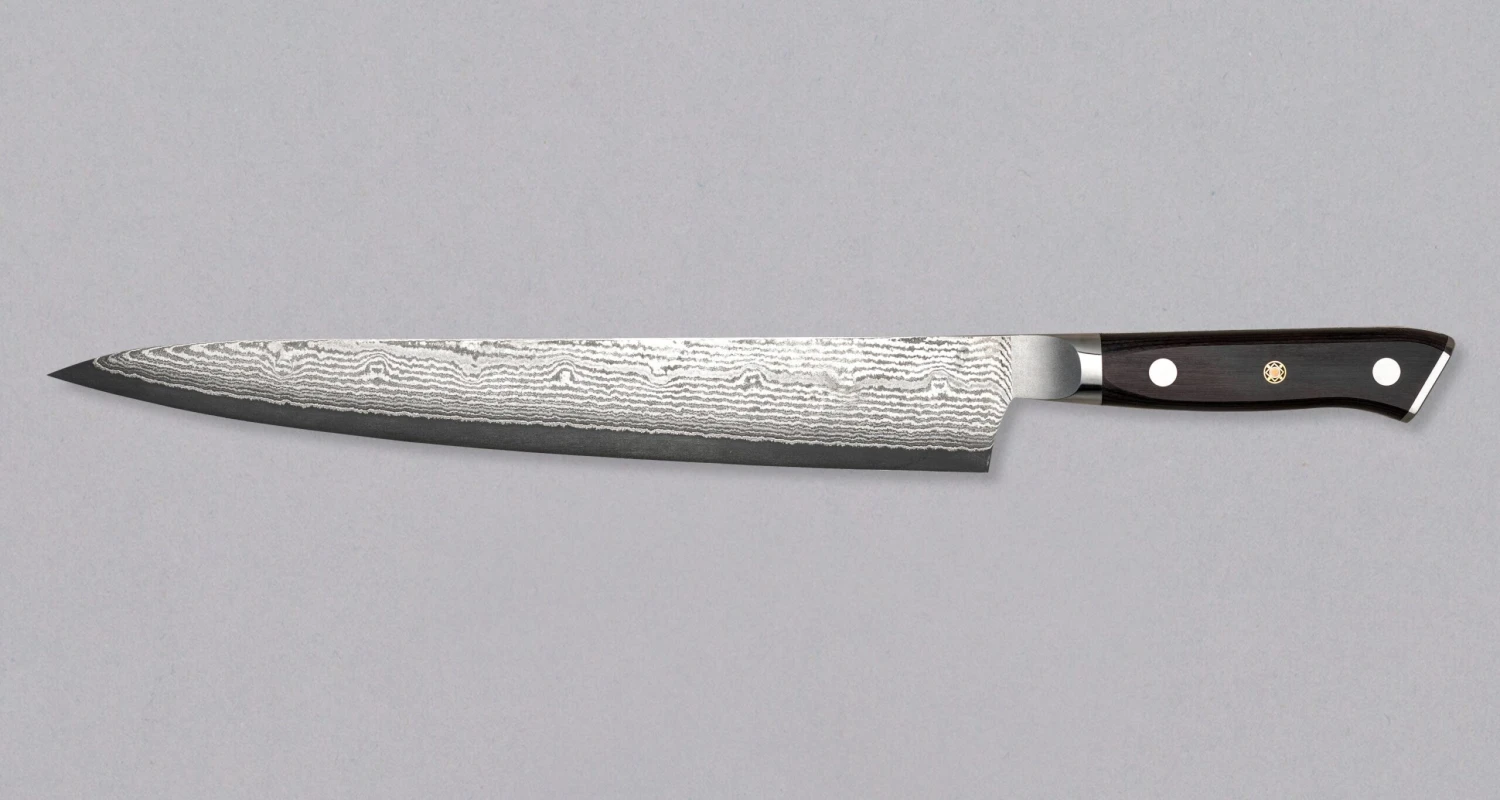 Mcusta Slicer VG-10 Black Damascus features a 270mm (10.6″) long blade, clad in what is called Black Damascus. The 33-layer Damascus cladding ensures that every knife has a unique pattern on the blade, which makes it one-of-a-kind.