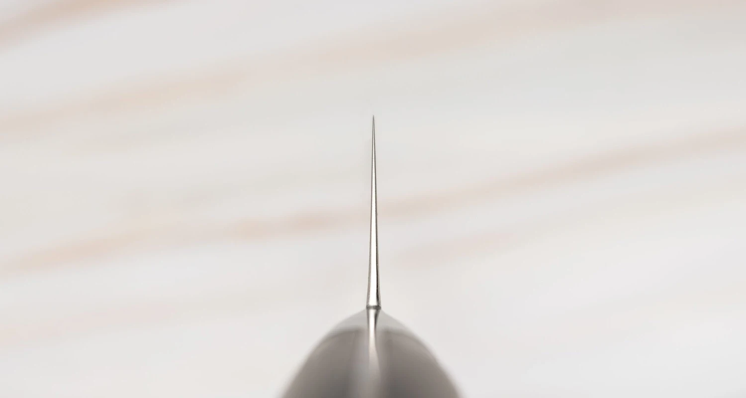 It has a double bevel (symmetrical) blade (50/50) with a hamaguri grind. The blade has a distal taper, meaning that the blane thins from the heel of the blade towards the tip. This gives it more strength and weight at the handle (meaning we can exert more pressure with the heel) and more precision at the tip, allowing for smooth and precise cuts.