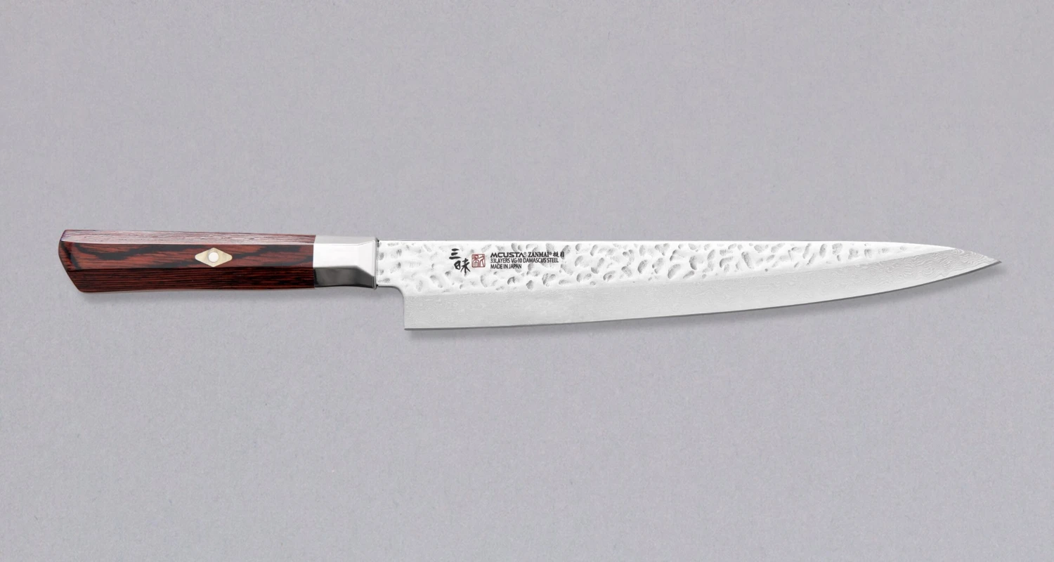Mcusta Sujihiki Supreme Hammered in 270mm (10.6″) blade length is a top-notch slicer knife. Slicers have slightly longer and narrower blades than Gyuto knives, so they are intended for long pulls and precise cuts of meat and fish. Laser-cut by custom machines developed by Mcusta, this Sujihiki is made of stainless and great performing, easy to resharpen, VG-10 steel. The core is clad into 33 layers of softer, stainless Damascus steel. The top part of the blade features dents from the hammer, which have been polished to a high polish, while the bottom part of the blade features a subtle, wavy Damascus pattern.
