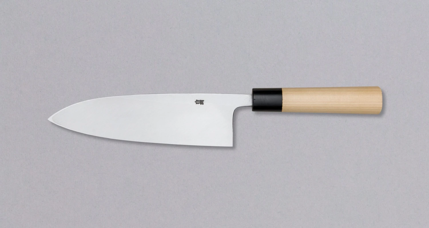 Miki Deba Shirogami in 210mm (8.3″) blade length is a heavy traditional Japanese knife for rougher tasks, intended for filleting fish and poultry. A proud member of the traditional Japanese trio (along with yanagiba and usuba knives). It is a large-sized deba designed for fish lovers and professional chefs. The blade thickness is at hefty 9.4mm (0.37″), the blade length is 210mm (8.3″), so it is suitable for filleting large-sized fish. Deba also performs well at smaller kitchen tasks, like mincing herbs or cleaning and preparing vegetables. The single bevel blade is suitable 🚨 for right-handed users only!