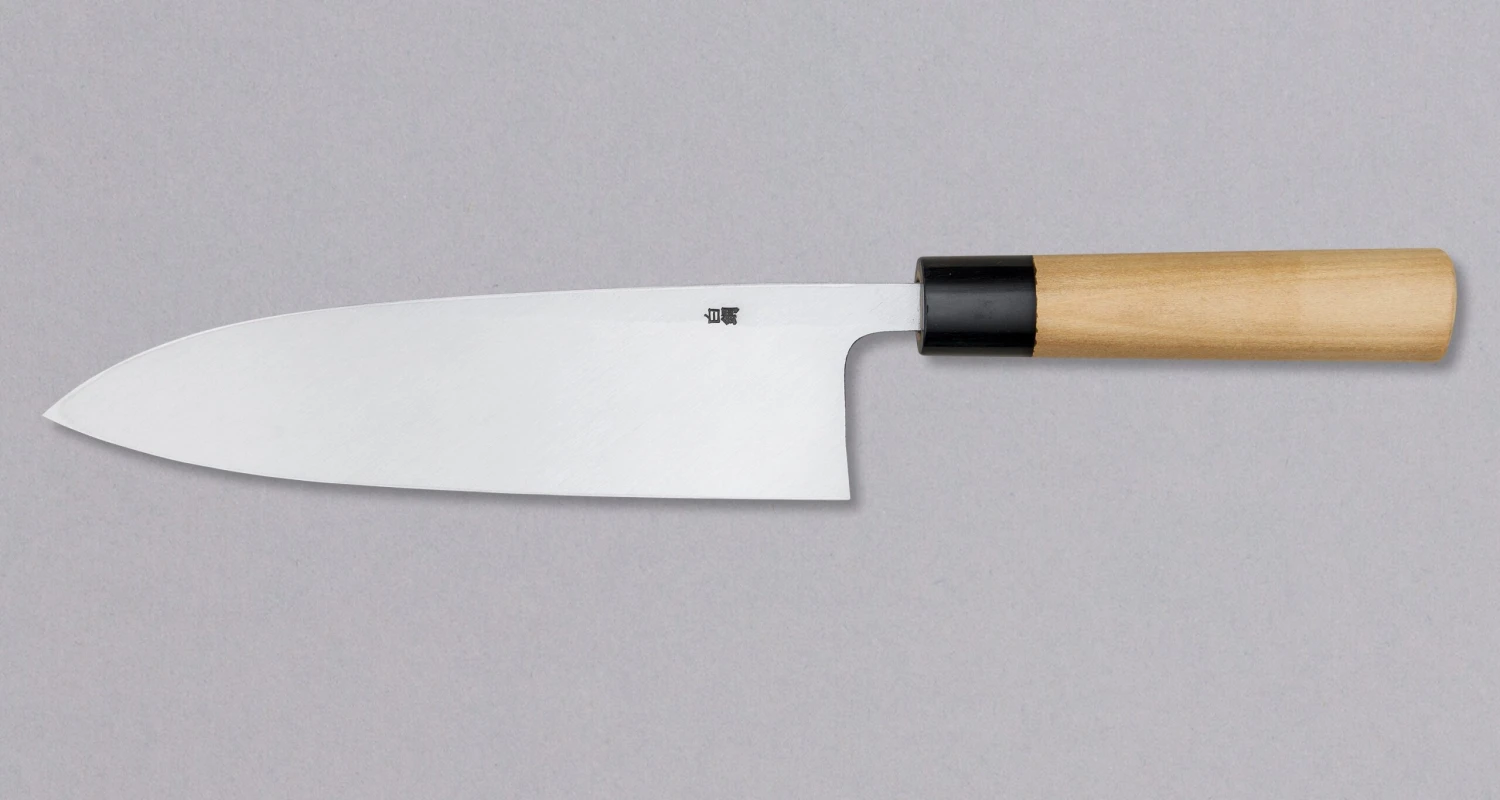 Miki Deba Shirogami in 240mm (9.5″) blade length is a heavy traditional Japanese knife for rougher tasks, intended for filleting fish and poultry. A proud member of the traditional Japanese trio (along with yanagiba and usuba knives). It is a large-sized deba designed for fish lovers and professional chefs. The blade thickness is at hefty 9.4mm (0.37″), the blade length is 240mm (9.5″), so it is suitable for filleting large-sized fish. Deba also performs well at smaller kitchen tasks, like mincing herbs or cleaning and preparing vegetables. The single bevel blade is suitable 🚨 for right-handed users only!
