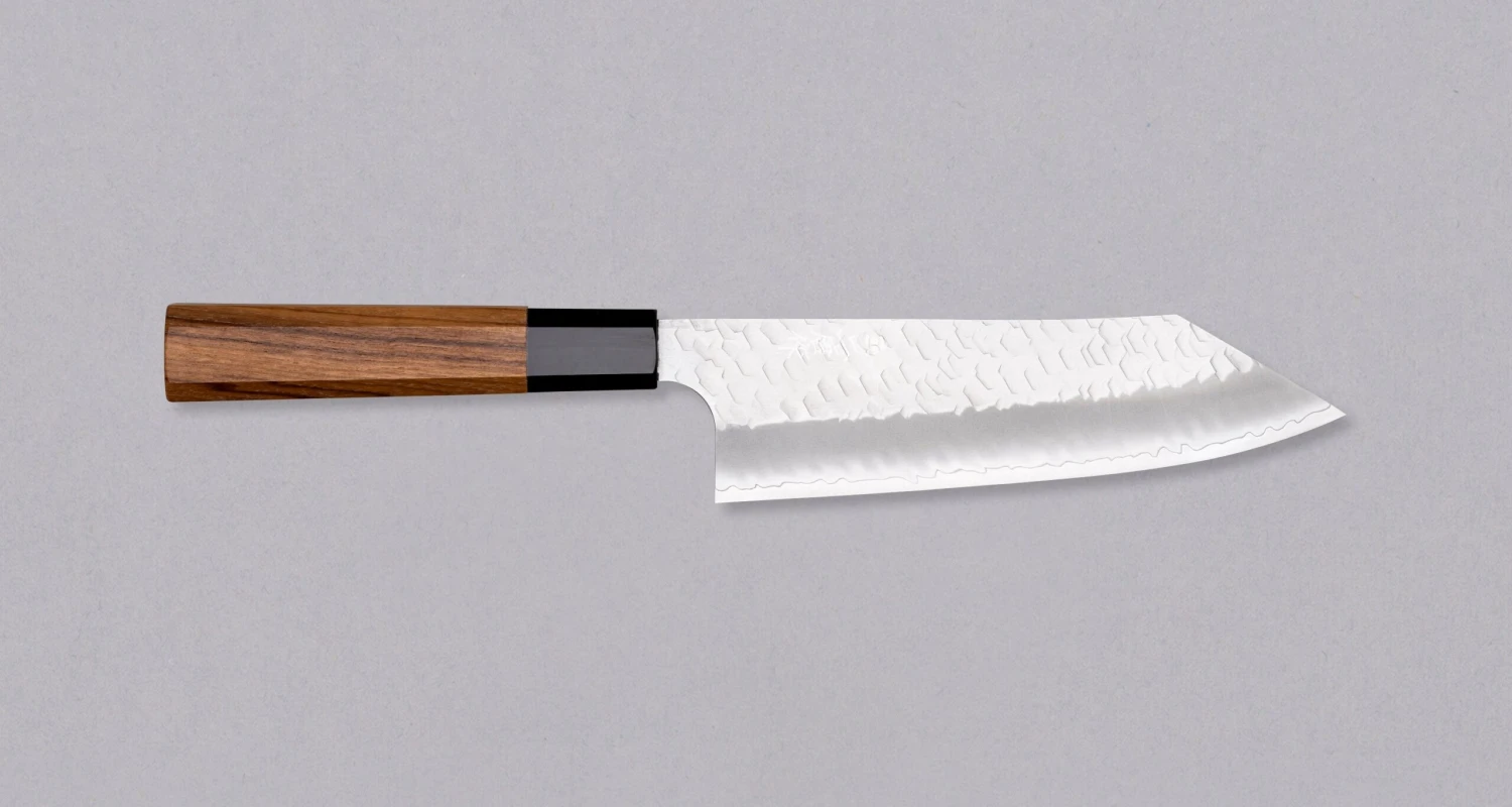 The 180 mm long bunka is a versatile kitchen knife that excels at all types of chopping and cutting on the cutting board. The blade is finished with a “K-tip” tip, typical of Japanese swords and daggers. Its flat profile allows for efficient chopping and slicing, while the curved edge enables smooth rocking motions for precise mincing and dicing.