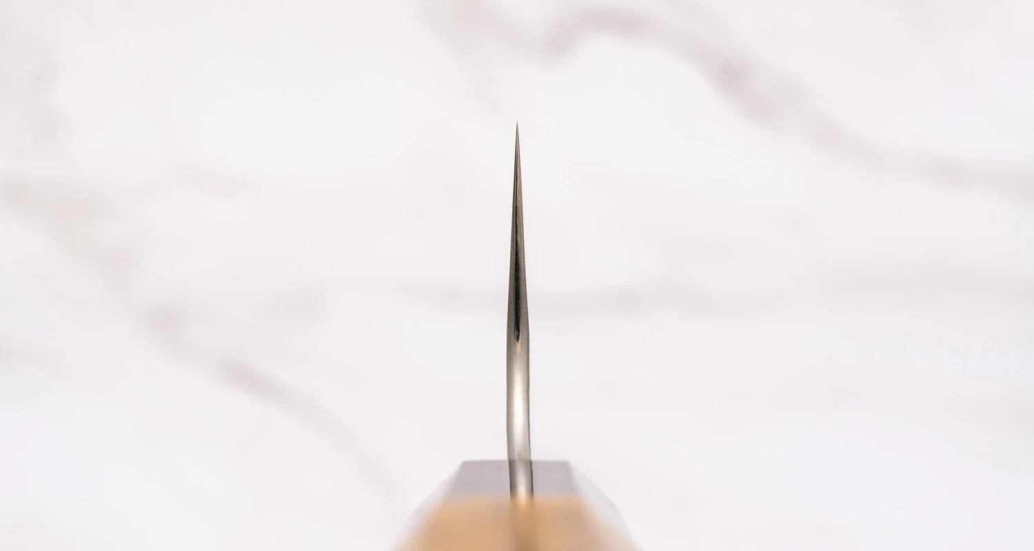 It has a double bevel (symmetrical) blade with convex (full hamaguri) grind. Hamaguri grind allows superior sharpness that requires delicate handling and helps to prevent food from sticking to the blade. Such a shape keeps a lot of metal behind the edge and makes for a stronger edge, yet it still allows a good degree of sharpness. The downside to a convex grind is that it is very hard to reproduce by anyone other than a very experienced sharpener.