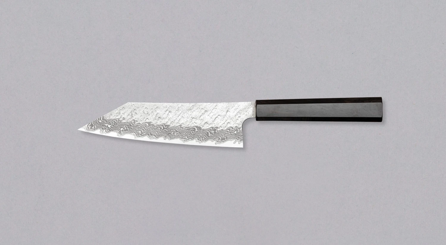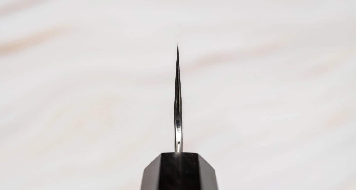 The blade finish of the knife is a unique fusion of tsuchime hammer indentations, reminiscent of hail, and a complex wavy damascus pattern. The surface of the blade was treated with a special textured hammer, leaving complex geometric impressions on its upper part. It is a stunning technique that involves skillfully hammering the blade’s surface to create captivating indentations, which—aside from the purely aesthetic—also has a distinct practical function of reducing friction and creating air pockets that diminish the sticking of food to the blade during cutting. The tsuchime indentations seamlessly blend into the damascus pattern, which flawlessly transitions into a glossy cutting edge.