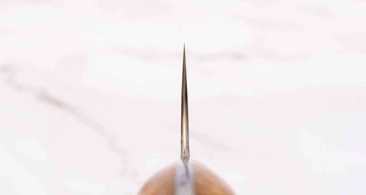 Gyuto is the most versatile and useful blade shape in the modern kitchen. It has a wide profile for easy food transfer and tends to be fairly flat towards the heel, enabling easy and fast chopping on the cutting board. A pointed tip allows piercing and precise, delicate work. A slight curve between the tip and the midsection makes the belly great for rocking the blade back and forth when cutting. It can be used for cutting meat, fish and vegetables.