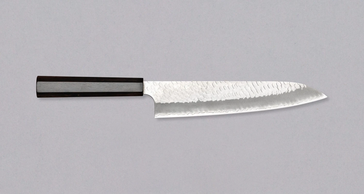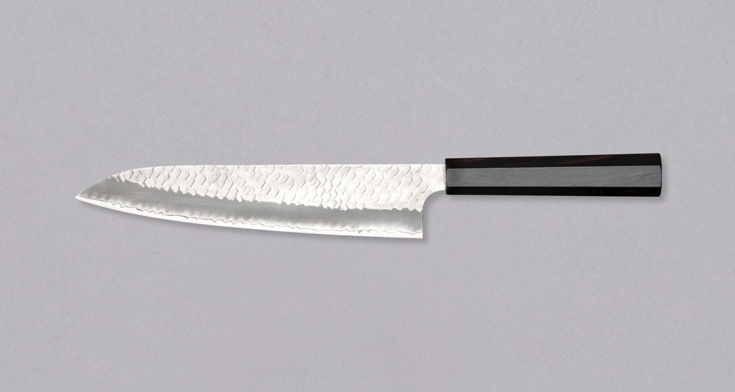 The unique hammer strokes ensure that ingredients do not stick to the blade during cutting, allowing for faster and more precise work. The smooth Japanese wa handle is made of dark ebony and gives the knife an elegant minimalistic look.