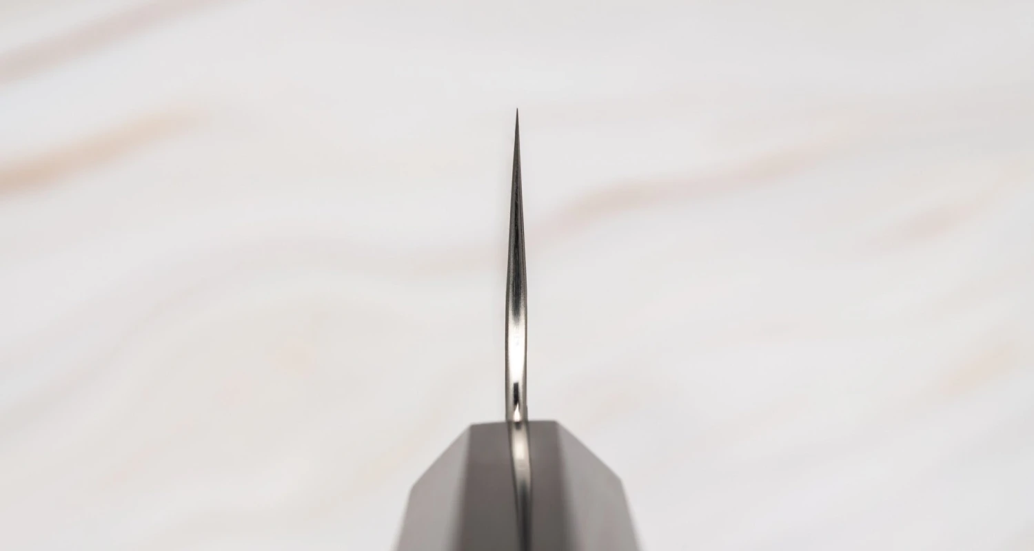 A high hardness of around 64 HRC means that the blade won’t be very tough, so the blade’s core was laminated using the san-mai method to improve its structural integrity and subsequent ability to withstand impacts and prevent chipping. San-mai translates to “three layers” in Japanese, referring to a blade that is composed of a primary, inner layer of harder steel (hagane) and of two secondary, outer layers of softer steel (jigane) that protect the prior.