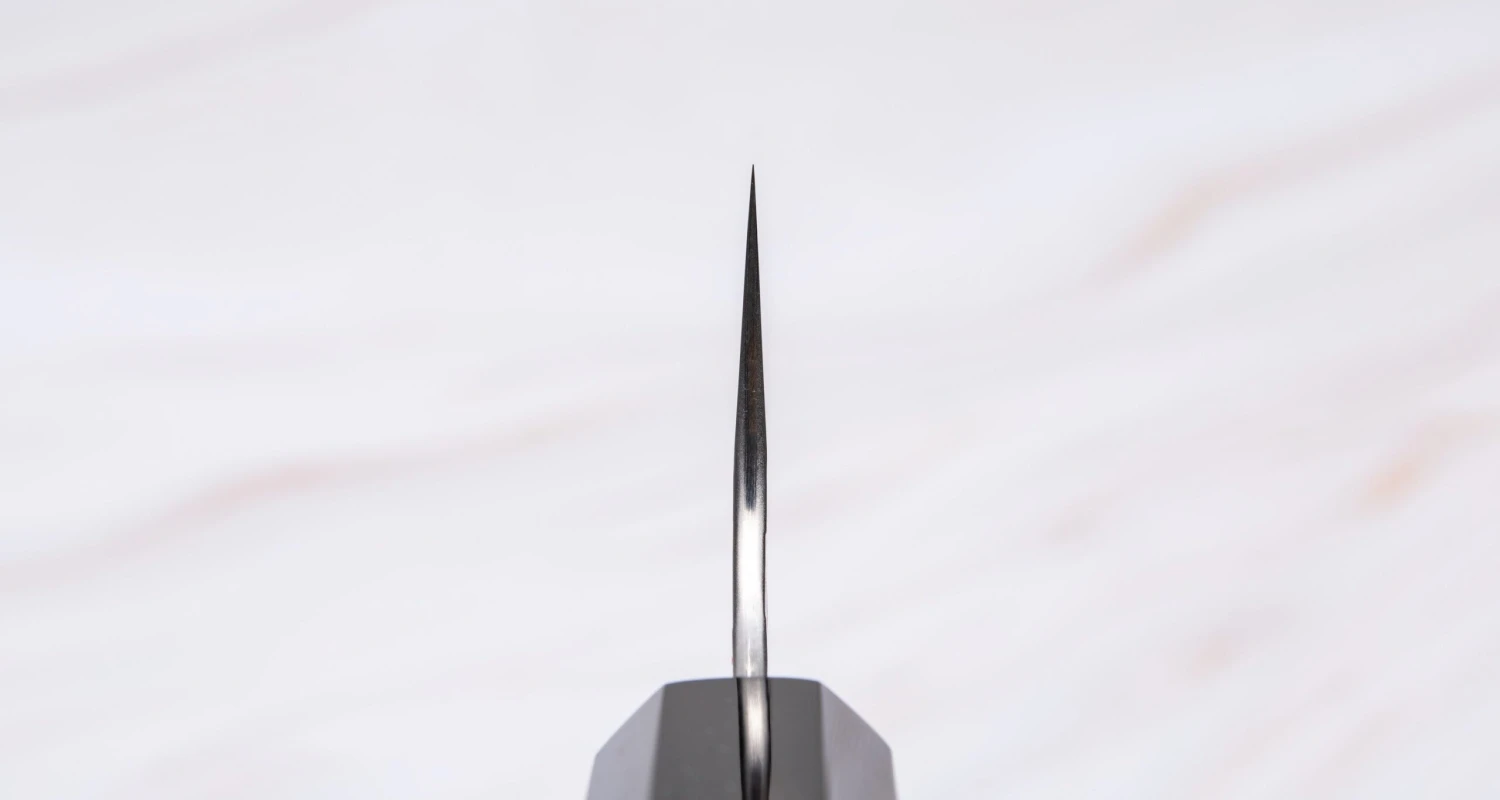 It has a double bevel (symmetrical) blade with convex (full hamaguri) grind. Hamaguri grind allows superior sharpness that requires delicate handling and helps to prevent food from sticking to the blade. Such a shape keeps a lot of metal behind the edge and makes for a stronger edge, yet it still allows a good degree of sharpness. The downside to a convex grind is that it is very hard to reproduce by anyone other than a very experienced sharpener.