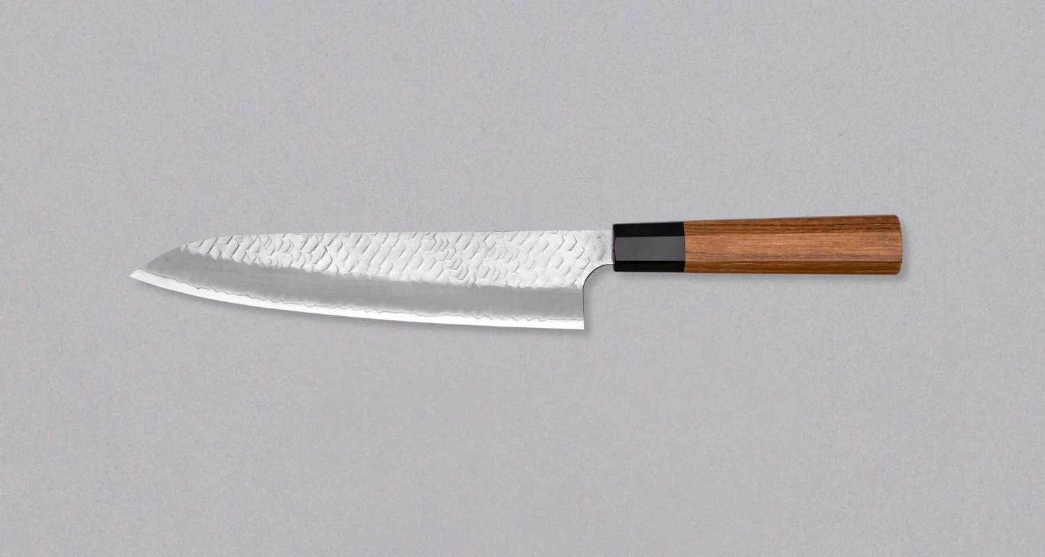 Gyuto is the most versatile and useful blade shape in the modern kitchen. It has a wide profile for easy food transfer and tends to be fairly flat towards the heel, enabling easy and fast chopping on the cutting board. A pointed tip allows piercing and precise, delicate work. A slight curve between the tip and the midsection makes the belly great for rocking the blade back and forth when cutting. It can be used for cutting meat, fish and vegetables.