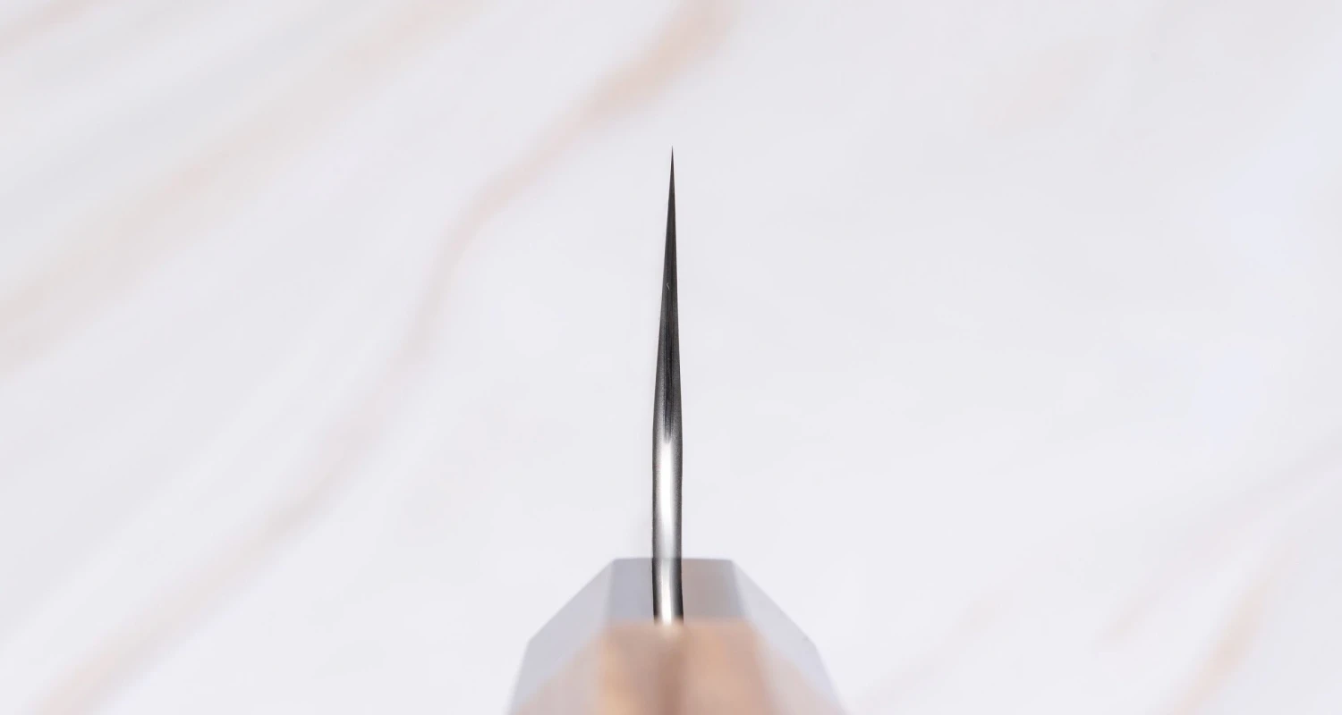 It has a double bevel (symmetrical) blade with convex (full hamaguri) grind. Hamaguri grind allows superior sharpness that requires delicate handling and helps to prevent food from sticking to the blade. Such a shape keeps a lot of metal behind the edge and makes for a stronger edge, yet it still allows a good degree of sharpness. The downside to a convex grind is that it is very hard to reproduce by anyone other than a very experienced sharpener.